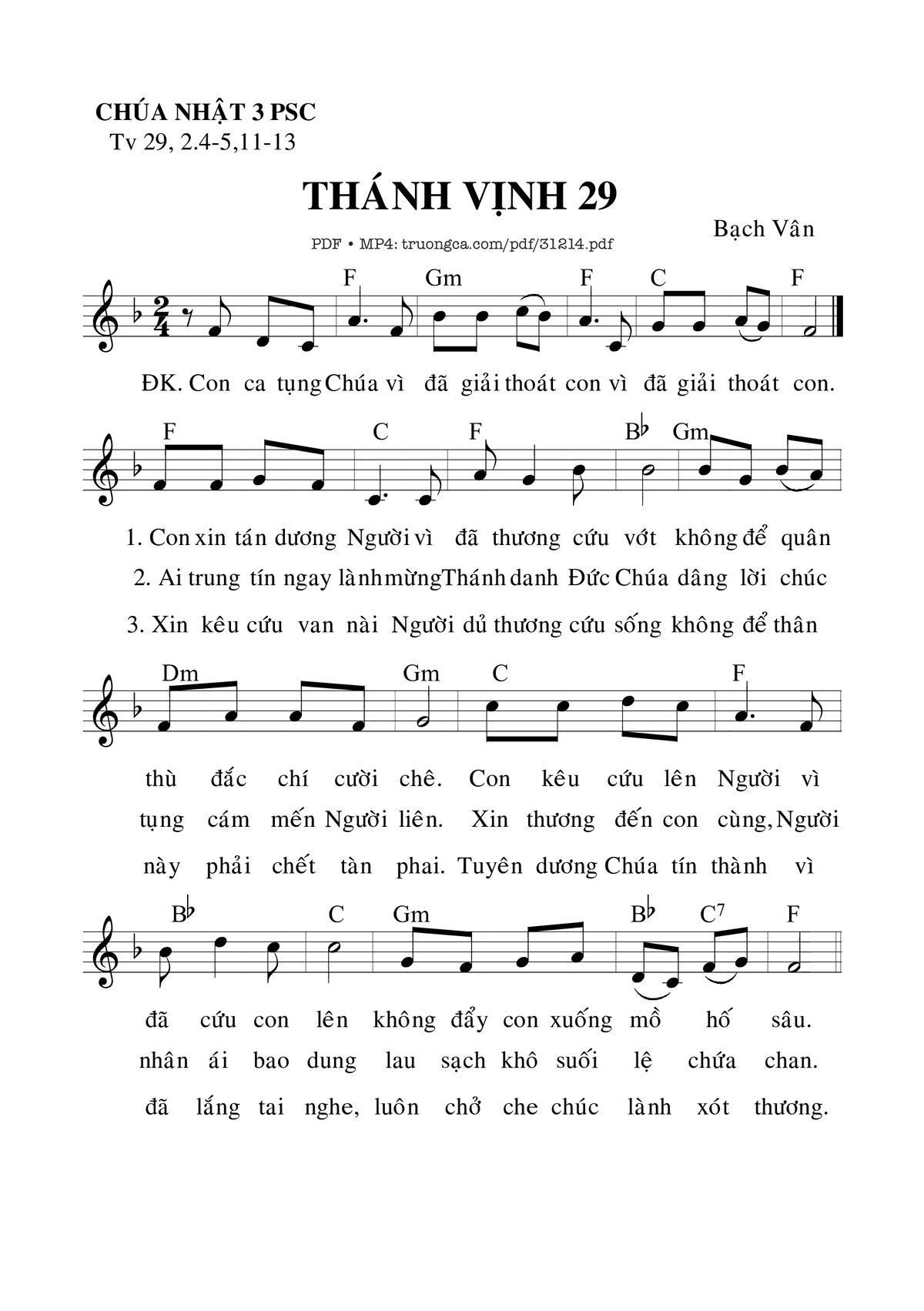 Sheet nhạc có nốt Chúa Nhật 3C Phục Sinh (Tv. 29) của nhạc sĩ Bạch Vân và file PDF nốt nhạc đăng lên đây nhằm giúp các bạn xướng âm cho đúng nốt và hát thêm hay, chỉ mang tính chất tham khảo, không có mục đích thương mại. Bản quyền thuộc về tác giả và tổ chức nắm bản quyền, Truongca.com không giữ bất kỳ bản quyền của nội dung nào cả. Các bạn có thể tải về bản PDF chất lượng cao, gồm khuông nhạc có nốt với đường link file PDF bên trên.