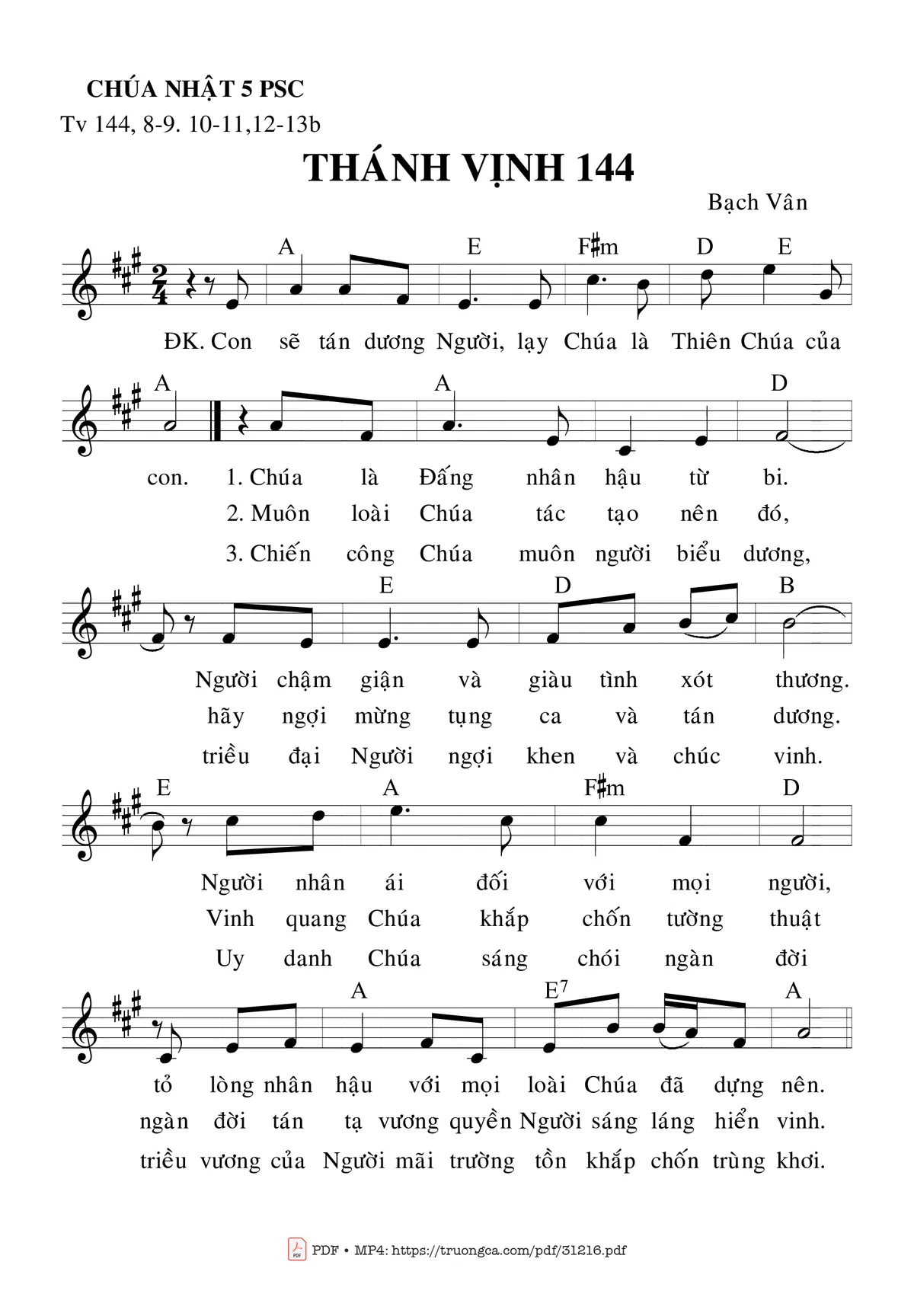 Sheet nhạc có nốt Thánh Vịnh 144, Chúa Nhật 5C Phục Sinh của nhạc sĩ Bạch Vân và file PDF nốt nhạc đăng lên đây nhằm giúp các bạn xướng âm cho đúng nốt và hát thêm hay, chỉ mang tính chất tham khảo, không có mục đích thương mại. Bản quyền thuộc về tác giả và tổ chức nắm bản quyền, Truongca.com không giữ bất kỳ bản quyền của nội dung nào cả. Các bạn có thể tải về bản PDF chất lượng cao, gồm khuông nhạc có nốt với đường link file PDF bên trên.