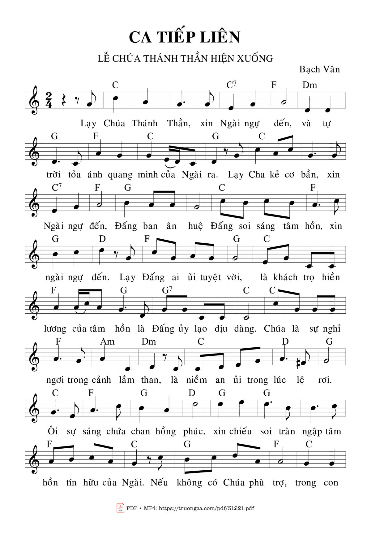 Sheet nhạc có nốt Ca Tiếp Liên Lễ Chúa Thánh Thần Hiện Xuống của nhạc sĩ Bạch Vân và file PDF nốt nhạc đăng lên đây nhằm giúp các bạn xướng âm cho đúng nốt và hát thêm hay, chỉ mang tính chất tham khảo, không có mục đích thương mại. Bản quyền thuộc về tác giả và tổ chức nắm bản quyền, Truongca.com không giữ bất kỳ bản quyền của nội dung nào cả. Các bạn có thể tải về bản PDF chất lượng cao, gồm khuông nhạc có nốt với đường link file PDF bên trên.