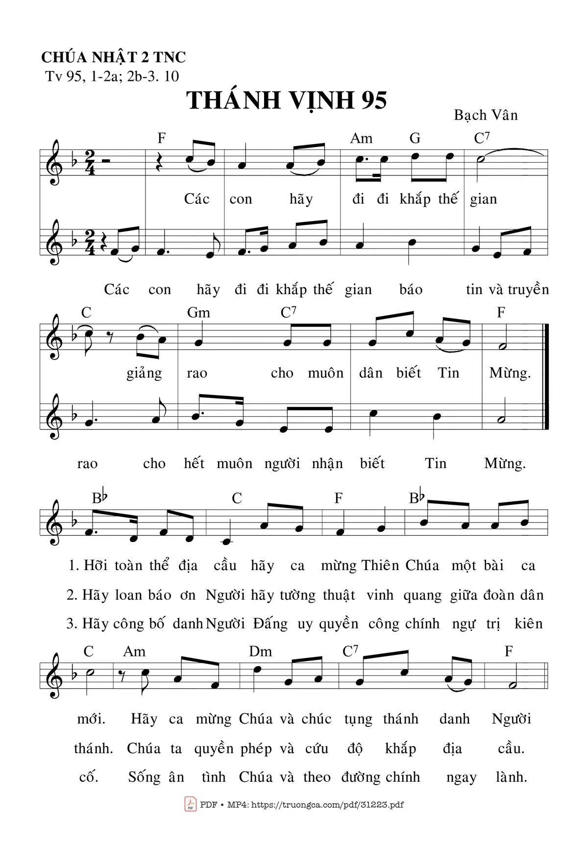 Sheet nhạc có nốt Thánh Vịnh 95, Chúa Nhật 2C Thường Niên của nhạc sĩ Bạch Vân và file PDF nốt nhạc đăng lên đây nhằm giúp các bạn xướng âm cho đúng nốt và hát thêm hay, chỉ mang tính chất tham khảo, không có mục đích thương mại. Bản quyền thuộc về tác giả và tổ chức nắm bản quyền, Truongca.com không giữ bất kỳ bản quyền của nội dung nào cả. Các bạn có thể tải về bản PDF chất lượng cao, gồm khuông nhạc có nốt với đường link file PDF bên trên.