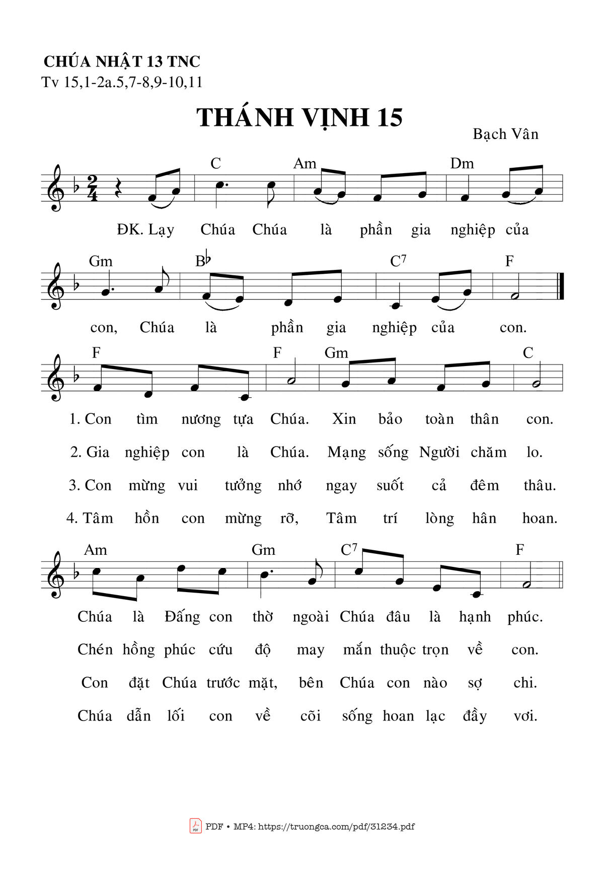 Sheet nhạc có nốt Thánh Vịnh 15, Chúa Nhật 13C Thường Niên của nhạc sĩ Bạch Vân và file PDF nốt nhạc đăng lên đây nhằm giúp các bạn xướng âm cho đúng nốt và hát thêm hay, chỉ mang tính chất tham khảo, không có mục đích thương mại. Bản quyền thuộc về tác giả và tổ chức nắm bản quyền, Truongca.com không giữ bất kỳ bản quyền của nội dung nào cả. Các bạn có thể tải về bản PDF chất lượng cao, gồm khuông nhạc có nốt với đường link file PDF bên trên.