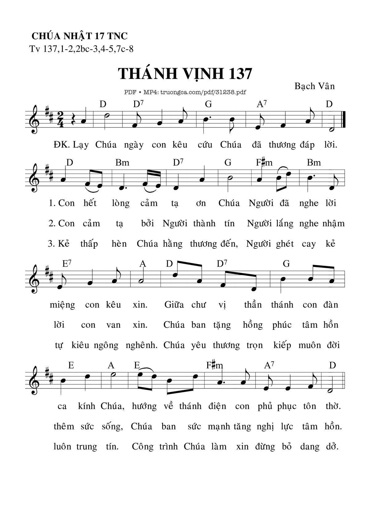 Sheet nhạc có nốt Thánh Vịnh 137, Chúa Nhật 17C Thường Niên của nhạc sĩ Bạch Vân và file PDF nốt nhạc đăng lên đây nhằm giúp các bạn xướng âm cho đúng nốt và hát thêm hay, chỉ mang tính chất tham khảo, không có mục đích thương mại. Bản quyền thuộc về tác giả và tổ chức nắm bản quyền, Truongca.com không giữ bất kỳ bản quyền của nội dung nào cả. Các bạn có thể tải về bản PDF chất lượng cao, gồm khuông nhạc có nốt với đường link file PDF bên trên.