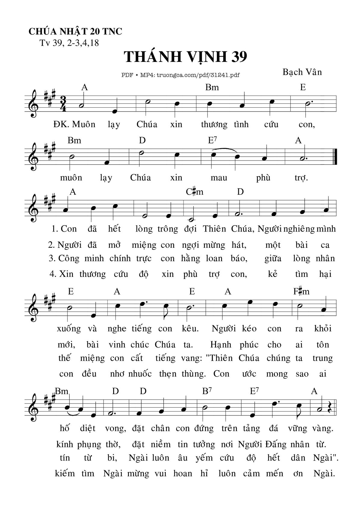 Sheet nhạc có nốt Thánh Vịnh 39, Chúa Nhật 20C Thường Niên của nhạc sĩ Bạch Vân và file PDF nốt nhạc đăng lên đây nhằm giúp các bạn xướng âm cho đúng nốt và hát thêm hay, chỉ mang tính chất tham khảo, không có mục đích thương mại. Bản quyền thuộc về tác giả và tổ chức nắm bản quyền, Truongca.com không giữ bất kỳ bản quyền của nội dung nào cả. Các bạn có thể tải về bản PDF chất lượng cao, gồm khuông nhạc có nốt với đường link file PDF bên trên.