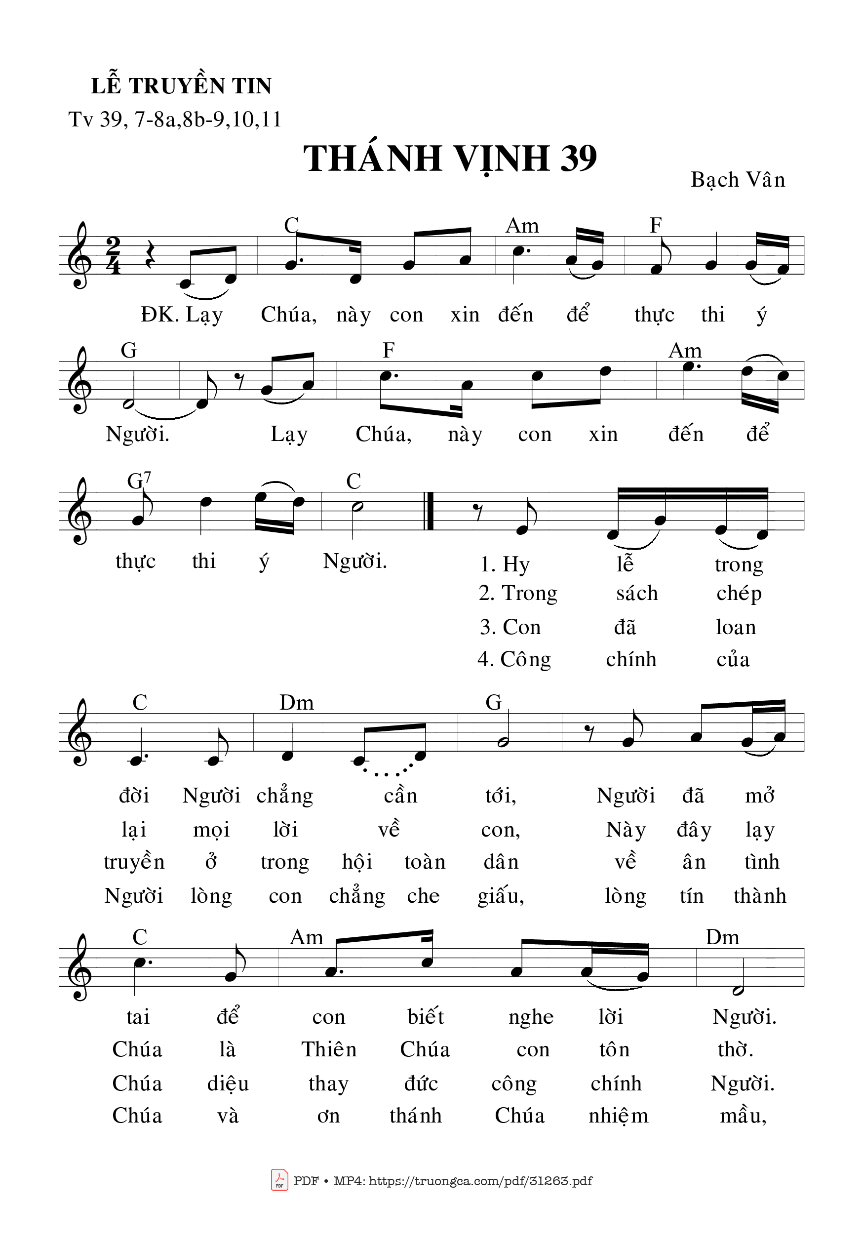 Sheet nhạc có nốt Thánh Vịnh 39, Lễ Truyền Tin của nhạc sĩ Bạch Vân và file PDF nốt nhạc đăng lên đây nhằm giúp các bạn xướng âm cho đúng nốt và hát thêm hay, chỉ mang tính chất tham khảo, không có mục đích thương mại. Bản quyền thuộc về tác giả và tổ chức nắm bản quyền, Truongca.com không giữ bất kỳ bản quyền của nội dung nào cả. Các bạn có thể tải về bản PDF chất lượng cao, gồm khuông nhạc có nốt với đường link file PDF bên trên.