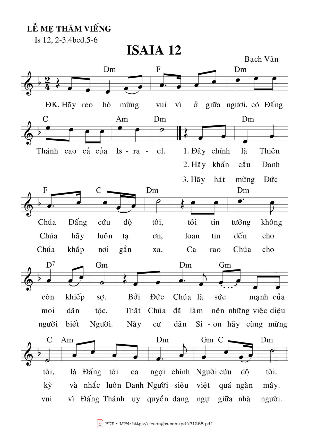 Sheet nhạc có nốt Lễ Mẹ Thăm Viếng của nhạc sĩ Bạch Vân và file PDF nốt nhạc đăng lên đây nhằm giúp các bạn xướng âm cho đúng nốt và hát thêm hay, chỉ mang tính chất tham khảo, không có mục đích thương mại. Bản quyền thuộc về tác giả và tổ chức nắm bản quyền, Truongca.com không giữ bất kỳ bản quyền của nội dung nào cả. Các bạn có thể tải về bản PDF chất lượng cao, gồm khuông nhạc có nốt với đường link file PDF bên trên.
