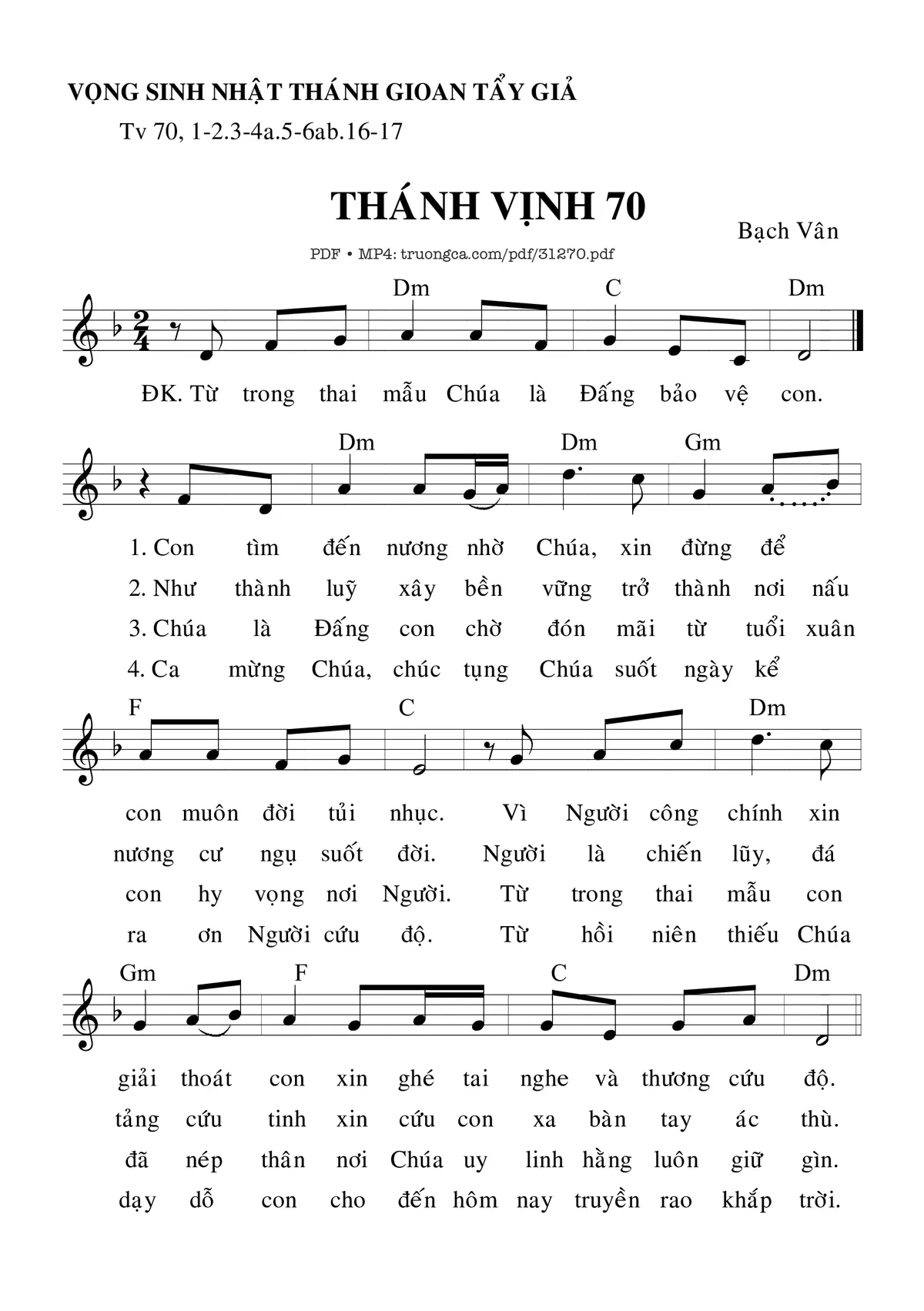 Sheet nhạc có nốt Thánh Vịnh 70, Lễ Vọng Sinh Nhật Thánh Gioan Tẩy Giả của nhạc sĩ Bạch Vân và file PDF nốt nhạc đăng lên đây nhằm giúp các bạn xướng âm cho đúng nốt và hát thêm hay, chỉ mang tính chất tham khảo, không có mục đích thương mại. Bản quyền thuộc về tác giả và tổ chức nắm bản quyền, Truongca.com không giữ bất kỳ bản quyền của nội dung nào cả. Các bạn có thể tải về bản PDF chất lượng cao, gồm khuông nhạc có nốt với đường link file PDF bên trên.