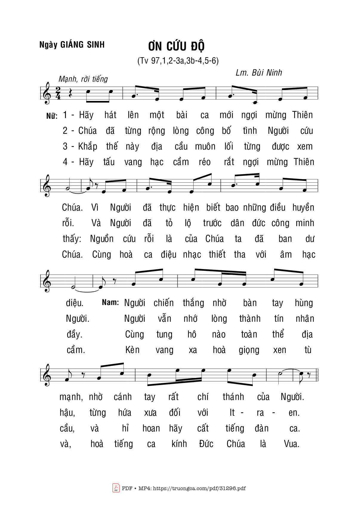 Sheet nhạc có nốt Ơn Cứu Độ của nhạc sĩ Bùi Ninh và file PDF nốt nhạc đăng lên đây nhằm giúp các bạn xướng âm cho đúng nốt và hát thêm hay, chỉ mang tính chất tham khảo, không có mục đích thương mại. Bản quyền thuộc về tác giả và tổ chức nắm bản quyền, Truongca.com không giữ bất kỳ bản quyền của nội dung nào cả. Các bạn có thể tải về bản PDF chất lượng cao, gồm khuông nhạc có nốt với đường link file PDF bên trên.