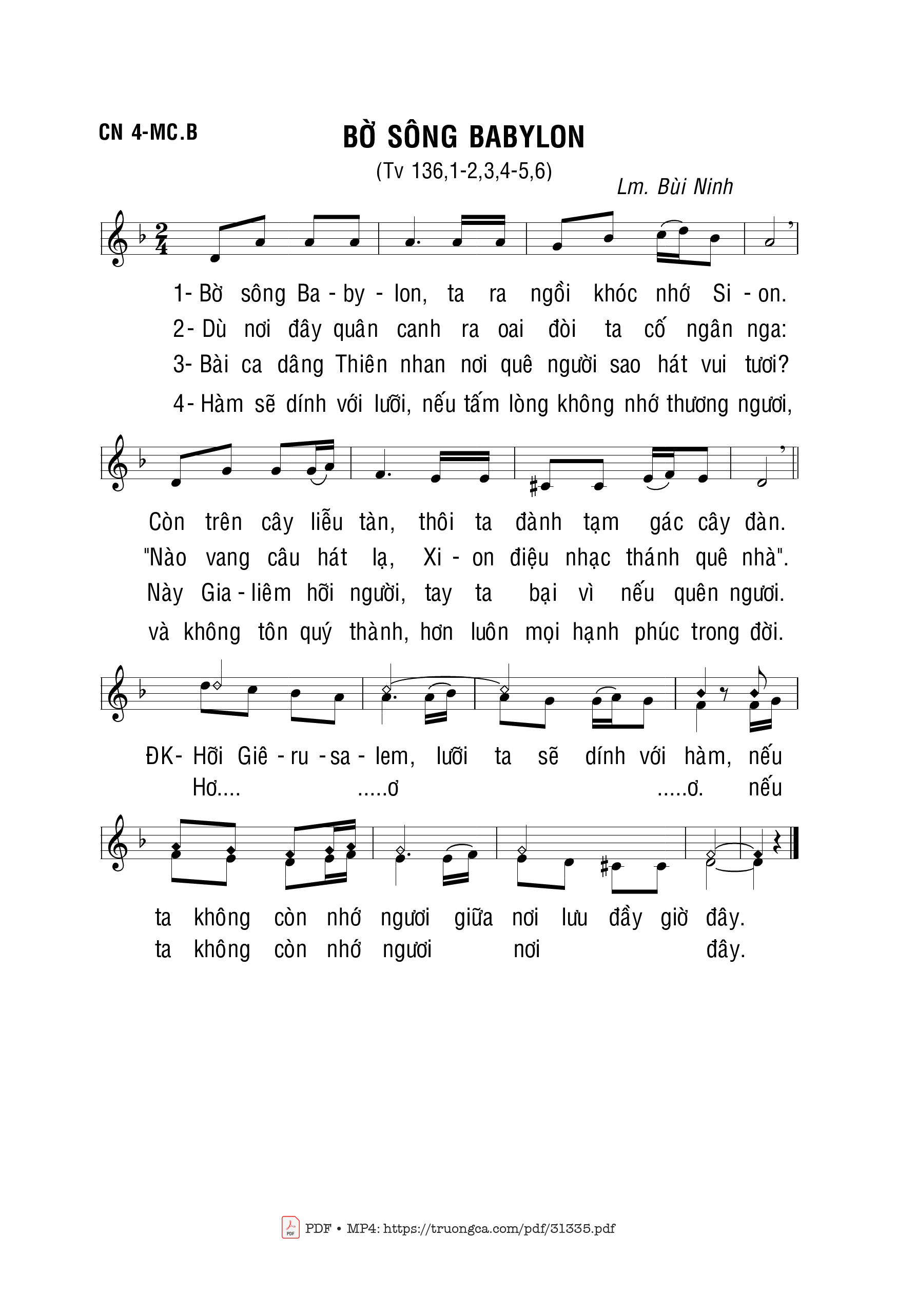 Sheet nhạc có nốt Bờ Sông Babylon của nhạc sĩ Bùi Ninh và file PDF nốt nhạc đăng lên đây nhằm giúp các bạn xướng âm cho đúng nốt và hát thêm hay, chỉ mang tính chất tham khảo, không có mục đích thương mại. Bản quyền thuộc về tác giả và tổ chức nắm bản quyền, Truongca.com không giữ bất kỳ bản quyền của nội dung nào cả. Các bạn có thể tải về bản PDF chất lượng cao, gồm khuông nhạc có nốt với đường link file PDF bên trên.