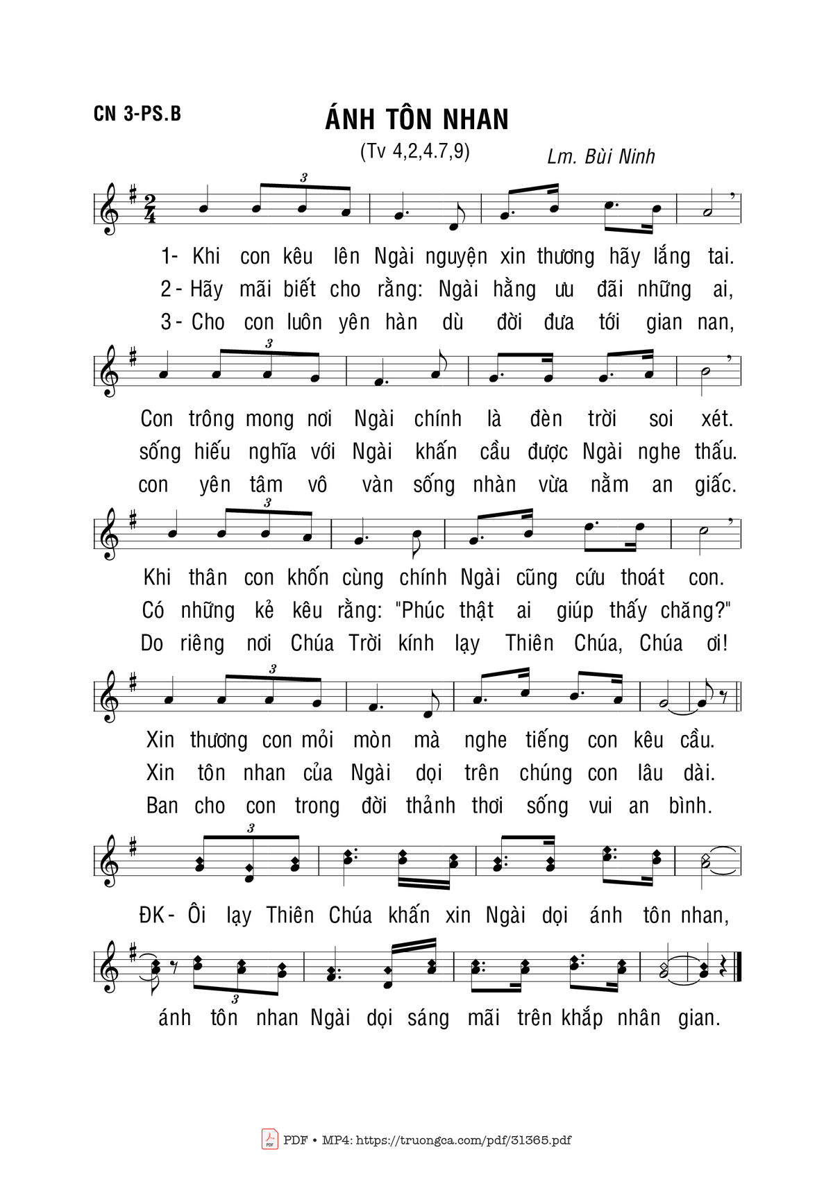 Sheet nhạc có nốt Ánh Tôn Nhan của nhạc sĩ Bùi Ninh và file PDF nốt nhạc đăng lên đây nhằm giúp các bạn xướng âm cho đúng nốt và hát thêm hay, chỉ mang tính chất tham khảo, không có mục đích thương mại. Bản quyền thuộc về tác giả và tổ chức nắm bản quyền, Truongca.com không giữ bất kỳ bản quyền của nội dung nào cả. Các bạn có thể tải về bản PDF chất lượng cao, gồm khuông nhạc có nốt với đường link file PDF bên trên.