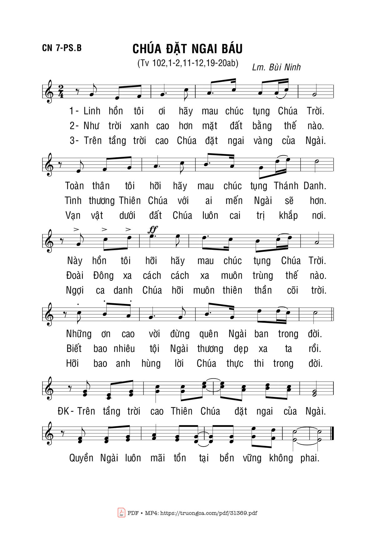 Sheet nhạc có nốt Chúa Đặt Ngai Báu của nhạc sĩ Bùi Ninh và file PDF nốt nhạc đăng lên đây nhằm giúp các bạn xướng âm cho đúng nốt và hát thêm hay, chỉ mang tính chất tham khảo, không có mục đích thương mại. Bản quyền thuộc về tác giả và tổ chức nắm bản quyền, Truongca.com không giữ bất kỳ bản quyền của nội dung nào cả. Các bạn có thể tải về bản PDF chất lượng cao, gồm khuông nhạc có nốt với đường link file PDF bên trên.