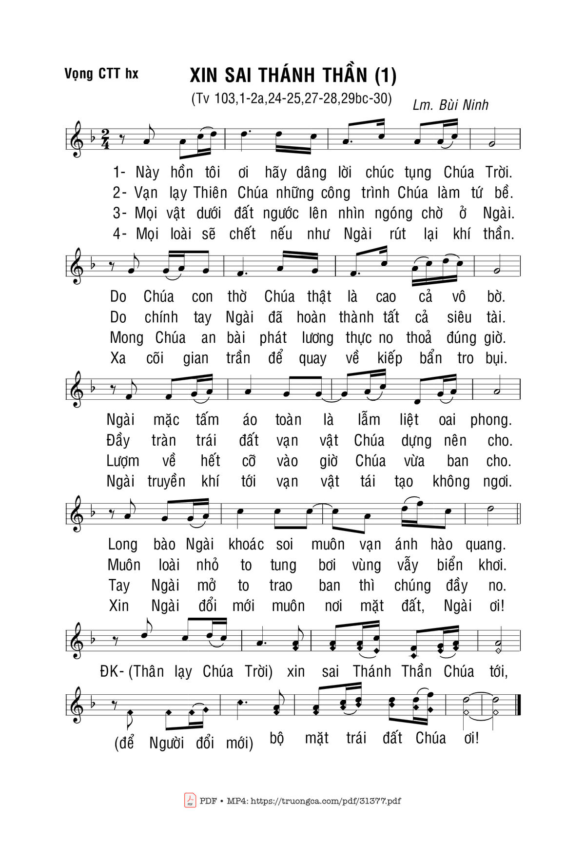 Sheet nhạc có nốt Xin Sai Thánh Thần (1) của nhạc sĩ Bùi Ninh và file PDF nốt nhạc đăng lên đây nhằm giúp các bạn xướng âm cho đúng nốt và hát thêm hay, chỉ mang tính chất tham khảo, không có mục đích thương mại. Bản quyền thuộc về tác giả và tổ chức nắm bản quyền, Truongca.com không giữ bất kỳ bản quyền của nội dung nào cả. Các bạn có thể tải về bản PDF chất lượng cao, gồm khuông nhạc có nốt với đường link file PDF bên trên.