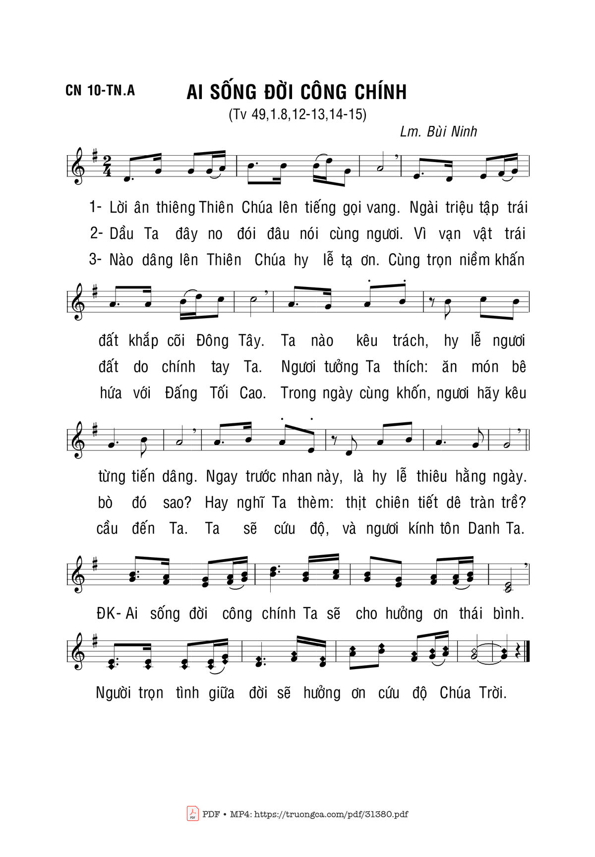 Sheet nhạc có nốt Ai Sống Đời Công Chính của nhạc sĩ Bùi Ninh và file PDF nốt nhạc đăng lên đây nhằm giúp các bạn xướng âm cho đúng nốt và hát thêm hay, chỉ mang tính chất tham khảo, không có mục đích thương mại. Bản quyền thuộc về tác giả và tổ chức nắm bản quyền, Truongca.com không giữ bất kỳ bản quyền của nội dung nào cả. Các bạn có thể tải về bản PDF chất lượng cao, gồm khuông nhạc có nốt với đường link file PDF bên trên.
