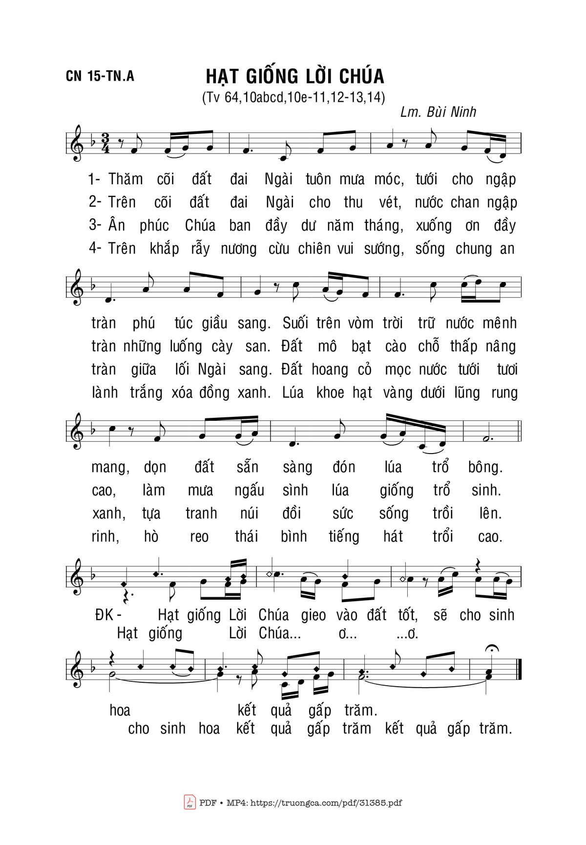 Sheet nhạc có nốt Hạt Giống Lời Chúa của nhạc sĩ Bùi Ninh và file PDF nốt nhạc đăng lên đây nhằm giúp các bạn xướng âm cho đúng nốt và hát thêm hay, chỉ mang tính chất tham khảo, không có mục đích thương mại. Bản quyền thuộc về tác giả và tổ chức nắm bản quyền, Truongca.com không giữ bất kỳ bản quyền của nội dung nào cả. Các bạn có thể tải về bản PDF chất lượng cao, gồm khuông nhạc có nốt với đường link file PDF bên trên.