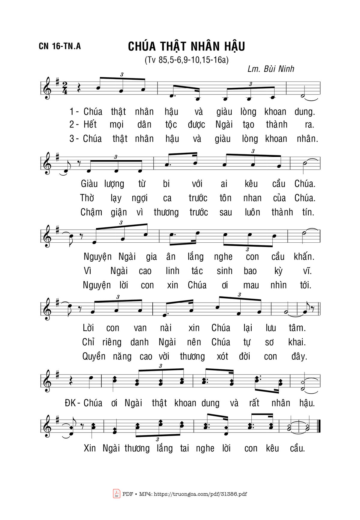 Sheet nhạc có nốt Chúa Thật Nhân Hậu của nhạc sĩ Bùi Ninh và file PDF nốt nhạc đăng lên đây nhằm giúp các bạn xướng âm cho đúng nốt và hát thêm hay, chỉ mang tính chất tham khảo, không có mục đích thương mại. Bản quyền thuộc về tác giả và tổ chức nắm bản quyền, Truongca.com không giữ bất kỳ bản quyền của nội dung nào cả. Các bạn có thể tải về bản PDF chất lượng cao, gồm khuông nhạc có nốt với đường link file PDF bên trên.