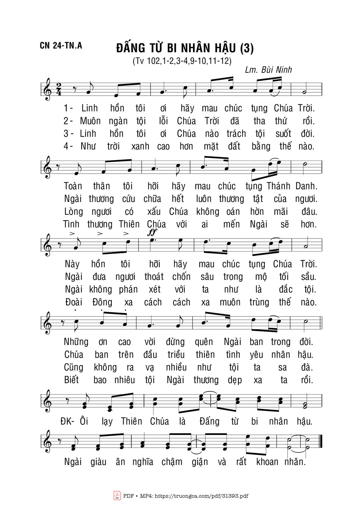 Sheet nhạc có nốt Đấng Từ Bi Nhân Hậu (3) của nhạc sĩ Bùi Ninh và file PDF nốt nhạc đăng lên đây nhằm giúp các bạn xướng âm cho đúng nốt và hát thêm hay, chỉ mang tính chất tham khảo, không có mục đích thương mại. Bản quyền thuộc về tác giả và tổ chức nắm bản quyền, Truongca.com không giữ bất kỳ bản quyền của nội dung nào cả. Các bạn có thể tải về bản PDF chất lượng cao, gồm khuông nhạc có nốt với đường link file PDF bên trên.