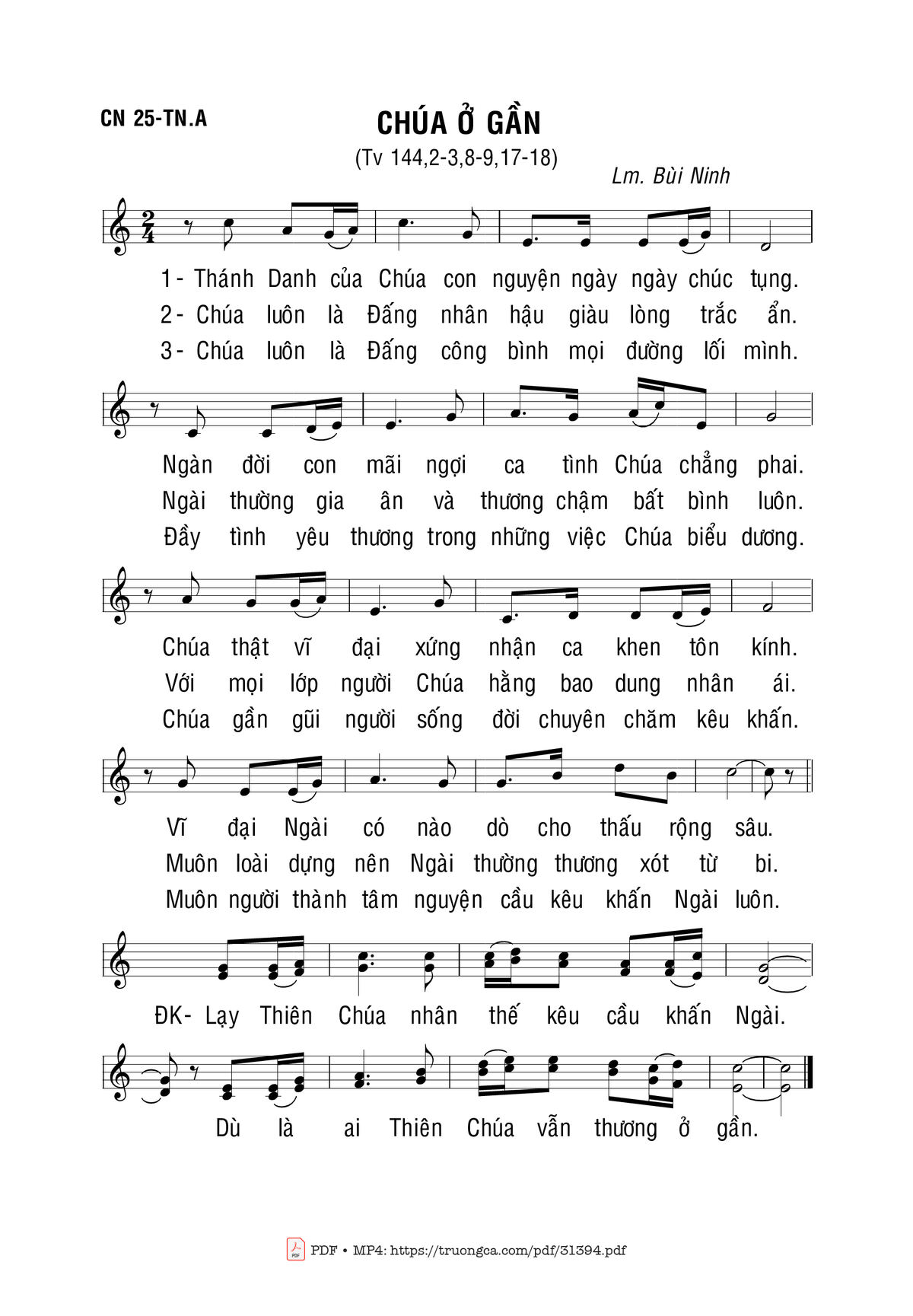 Sheet nhạc có nốt Chúa Ở Gần của nhạc sĩ Bùi Ninh và file PDF nốt nhạc đăng lên đây nhằm giúp các bạn xướng âm cho đúng nốt và hát thêm hay, chỉ mang tính chất tham khảo, không có mục đích thương mại. Bản quyền thuộc về tác giả và tổ chức nắm bản quyền, Truongca.com không giữ bất kỳ bản quyền của nội dung nào cả. Các bạn có thể tải về bản PDF chất lượng cao, gồm khuông nhạc có nốt với đường link file PDF bên trên.