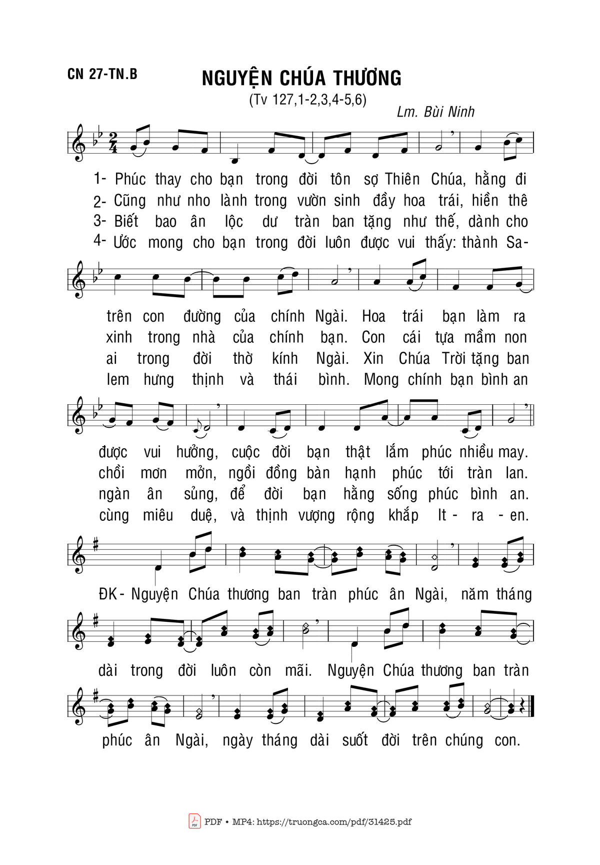 Sheet nhạc có nốt Nguyện Chúa Thương của nhạc sĩ Bùi Ninh và file PDF nốt nhạc đăng lên đây nhằm giúp các bạn xướng âm cho đúng nốt và hát thêm hay, chỉ mang tính chất tham khảo, không có mục đích thương mại. Bản quyền thuộc về tác giả và tổ chức nắm bản quyền, Truongca.com không giữ bất kỳ bản quyền của nội dung nào cả. Các bạn có thể tải về bản PDF chất lượng cao, gồm khuông nhạc có nốt với đường link file PDF bên trên.