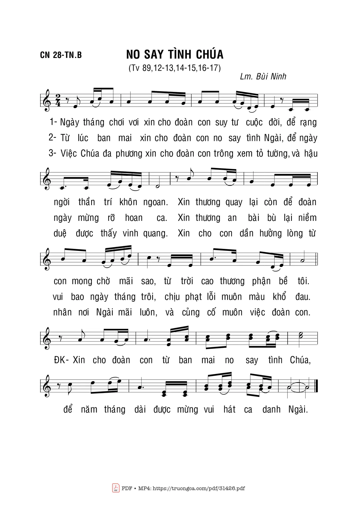 Sheet nhạc có nốt No Say Tình Chúa của nhạc sĩ Bùi Ninh và file PDF nốt nhạc đăng lên đây nhằm giúp các bạn xướng âm cho đúng nốt và hát thêm hay, chỉ mang tính chất tham khảo, không có mục đích thương mại. Bản quyền thuộc về tác giả và tổ chức nắm bản quyền, Truongca.com không giữ bất kỳ bản quyền của nội dung nào cả. Các bạn có thể tải về bản PDF chất lượng cao, gồm khuông nhạc có nốt với đường link file PDF bên trên.