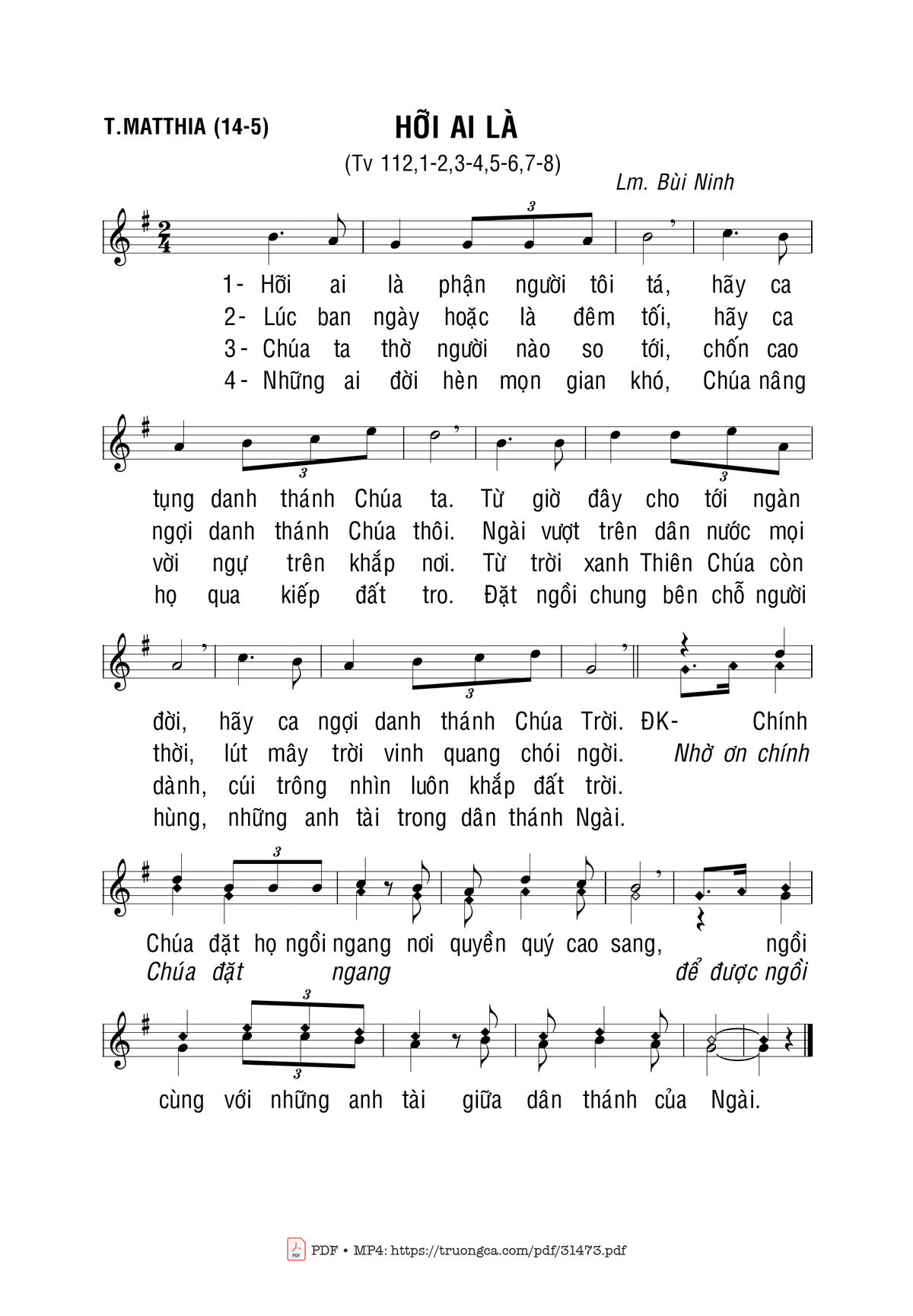 Sheet nhạc có nốt Thánh Vịnh 112, Thánh Matthia Tông Đồ của nhạc sĩ Bùi Ninh và file PDF nốt nhạc đăng lên đây nhằm giúp các bạn xướng âm cho đúng nốt và hát thêm hay, chỉ mang tính chất tham khảo, không có mục đích thương mại. Bản quyền thuộc về tác giả và tổ chức nắm bản quyền, Truongca.com không giữ bất kỳ bản quyền của nội dung nào cả. Các bạn có thể tải về bản PDF chất lượng cao, gồm khuông nhạc có nốt với đường link file PDF bên trên.