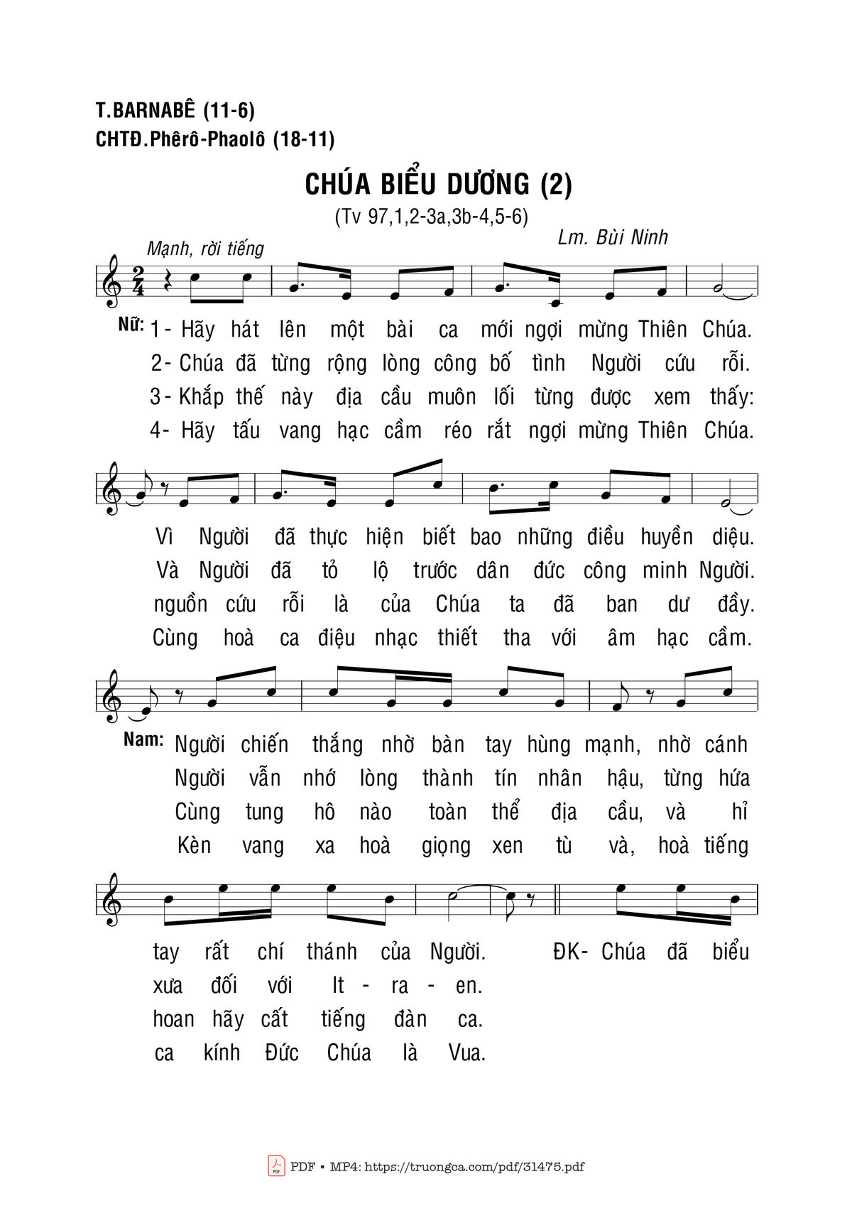 Sheet nhạc có nốt Thánh Vịnh 97, Thánh Barnabê T.đồ của nhạc sĩ Bùi Ninh và file PDF nốt nhạc đăng lên đây nhằm giúp các bạn xướng âm cho đúng nốt và hát thêm hay, chỉ mang tính chất tham khảo, không có mục đích thương mại. Bản quyền thuộc về tác giả và tổ chức nắm bản quyền, Truongca.com không giữ bất kỳ bản quyền của nội dung nào cả. Các bạn có thể tải về bản PDF chất lượng cao, gồm khuông nhạc có nốt với đường link file PDF bên trên.