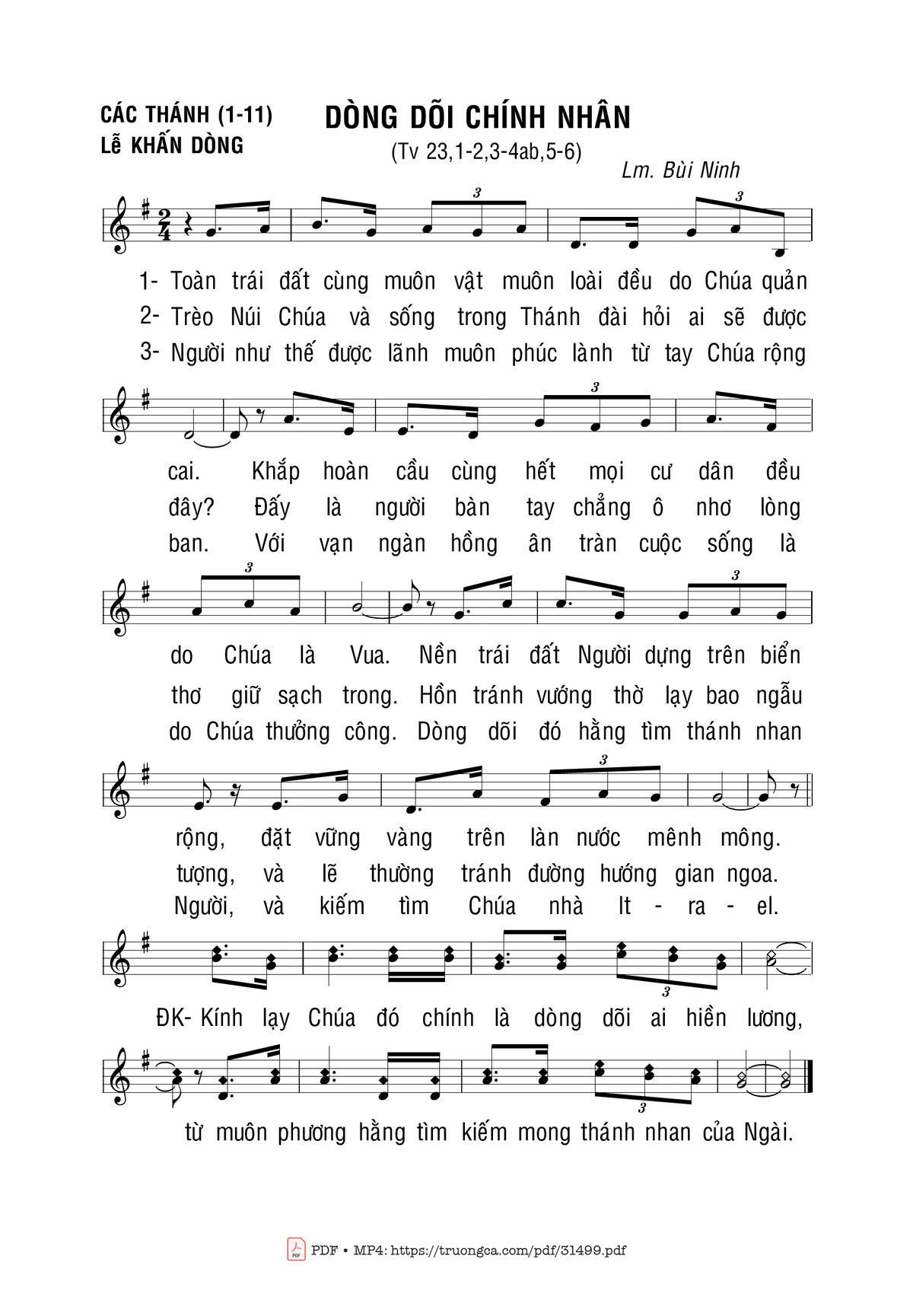 Sheet nhạc có nốt Thánh Vịnh 23, Dòng Dõi Chính Nhân của nhạc sĩ Bùi Ninh và file PDF nốt nhạc đăng lên đây nhằm giúp các bạn xướng âm cho đúng nốt và hát thêm hay, chỉ mang tính chất tham khảo, không có mục đích thương mại. Bản quyền thuộc về tác giả và tổ chức nắm bản quyền, Truongca.com không giữ bất kỳ bản quyền của nội dung nào cả. Các bạn có thể tải về bản PDF chất lượng cao, gồm khuông nhạc có nốt với đường link file PDF bên trên.