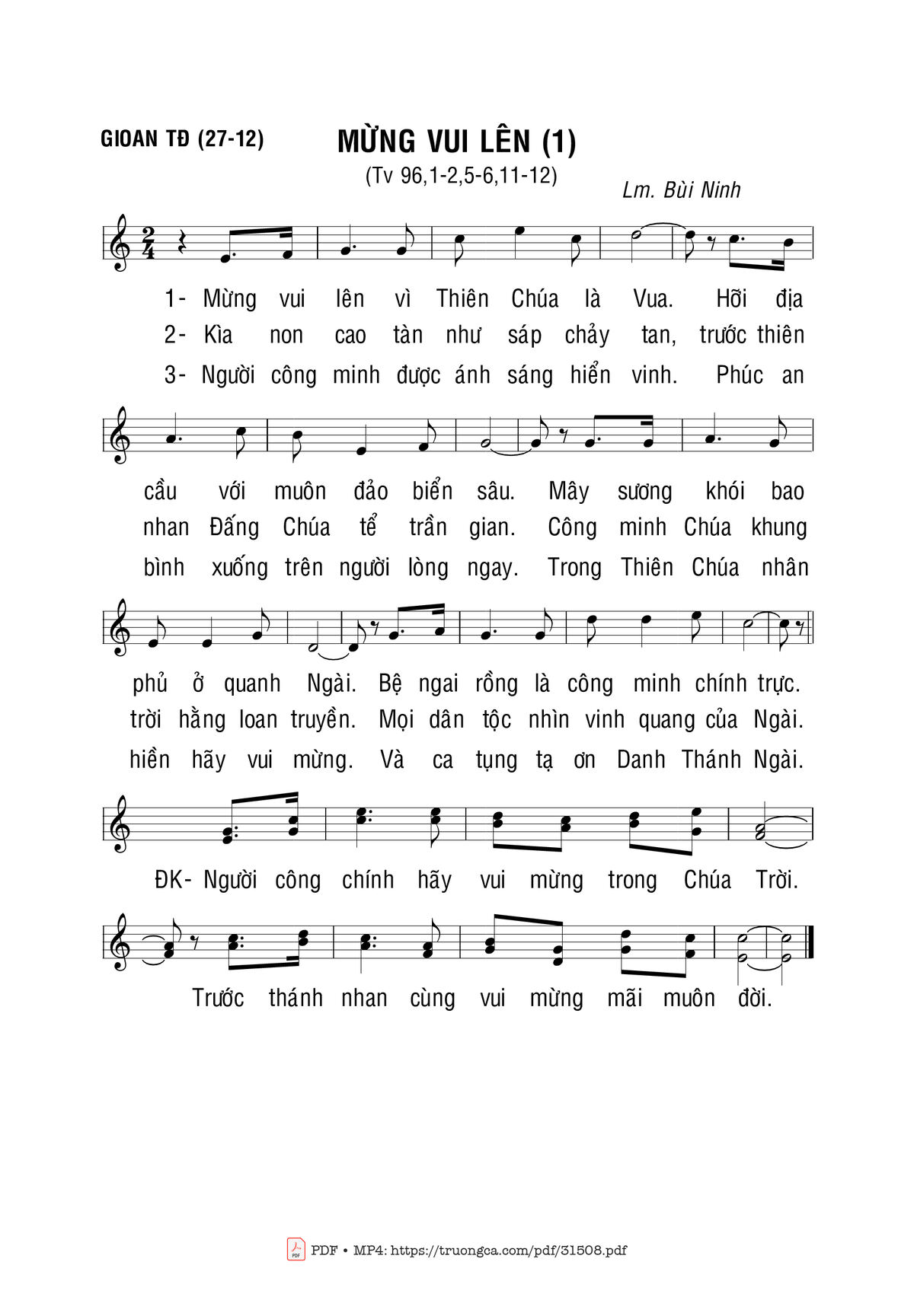 Sheet nhạc có nốt Thánh Vịnh 96, Mừng Vui Lên 1 của nhạc sĩ Bùi Ninh và file PDF nốt nhạc đăng lên đây nhằm giúp các bạn xướng âm cho đúng nốt và hát thêm hay, chỉ mang tính chất tham khảo, không có mục đích thương mại. Bản quyền thuộc về tác giả và tổ chức nắm bản quyền, Truongca.com không giữ bất kỳ bản quyền của nội dung nào cả. Các bạn có thể tải về bản PDF chất lượng cao, gồm khuông nhạc có nốt với đường link file PDF bên trên.