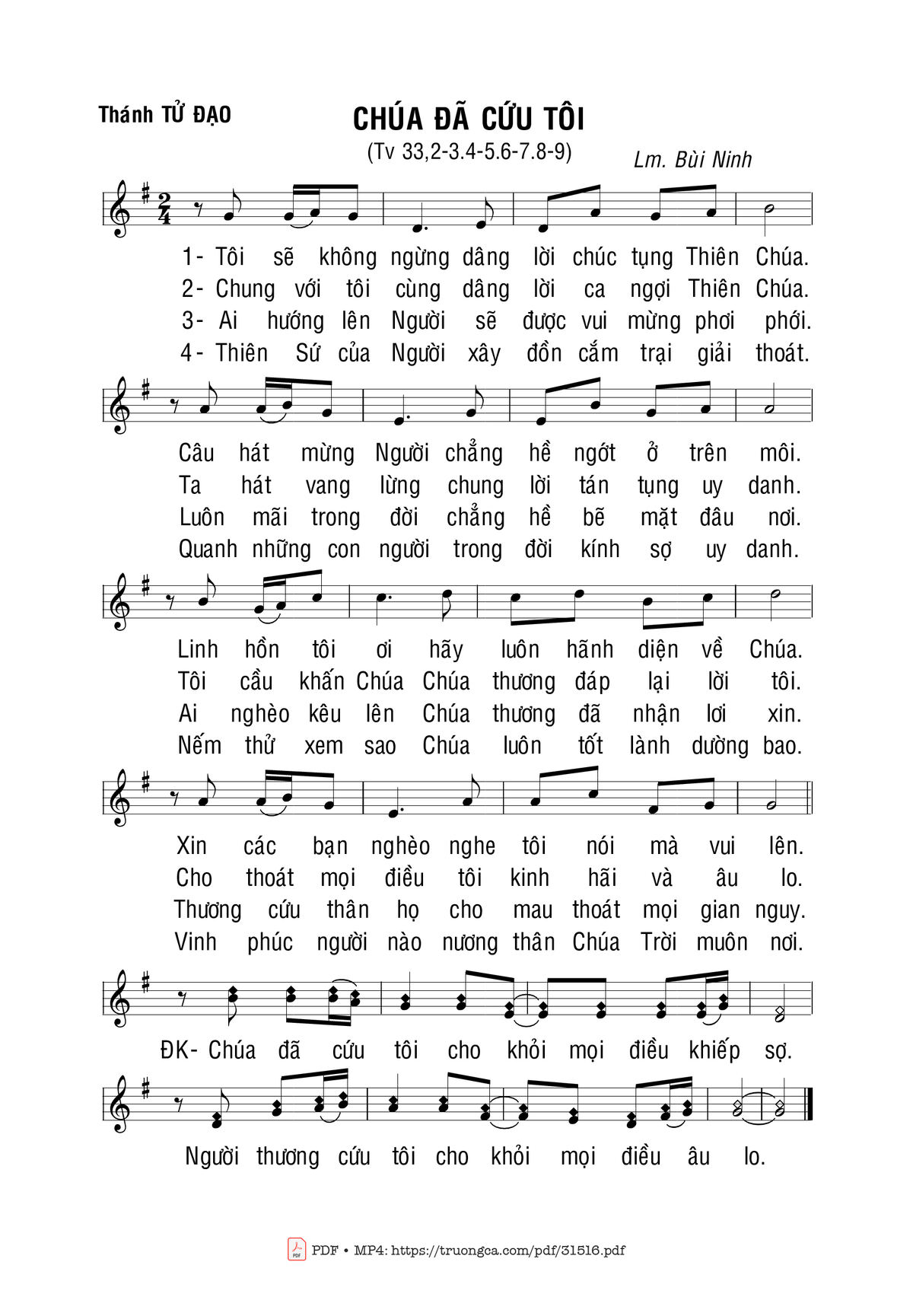 Sheet nhạc có nốt Thánh Vịnh 33, Chúa Đã Cứu Tôi của nhạc sĩ Bùi Ninh và file PDF nốt nhạc đăng lên đây nhằm giúp các bạn xướng âm cho đúng nốt và hát thêm hay, chỉ mang tính chất tham khảo, không có mục đích thương mại. Bản quyền thuộc về tác giả và tổ chức nắm bản quyền, Truongca.com không giữ bất kỳ bản quyền của nội dung nào cả. Các bạn có thể tải về bản PDF chất lượng cao, gồm khuông nhạc có nốt với đường link file PDF bên trên.