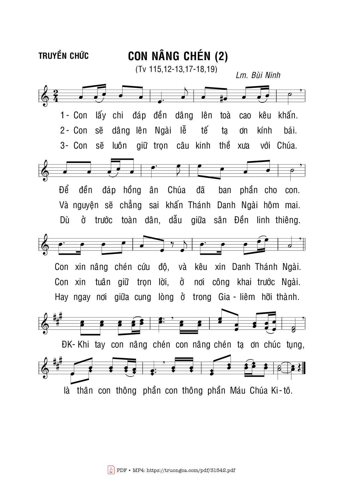 Sheet nhạc có nốt Thánh Vịnh 115, Con Nâng Chén (2 của nhạc sĩ Bùi Ninh và file PDF nốt nhạc đăng lên đây nhằm giúp các bạn xướng âm cho đúng nốt và hát thêm hay, chỉ mang tính chất tham khảo, không có mục đích thương mại. Bản quyền thuộc về tác giả và tổ chức nắm bản quyền, Truongca.com không giữ bất kỳ bản quyền của nội dung nào cả. Các bạn có thể tải về bản PDF chất lượng cao, gồm khuông nhạc có nốt với đường link file PDF bên trên.