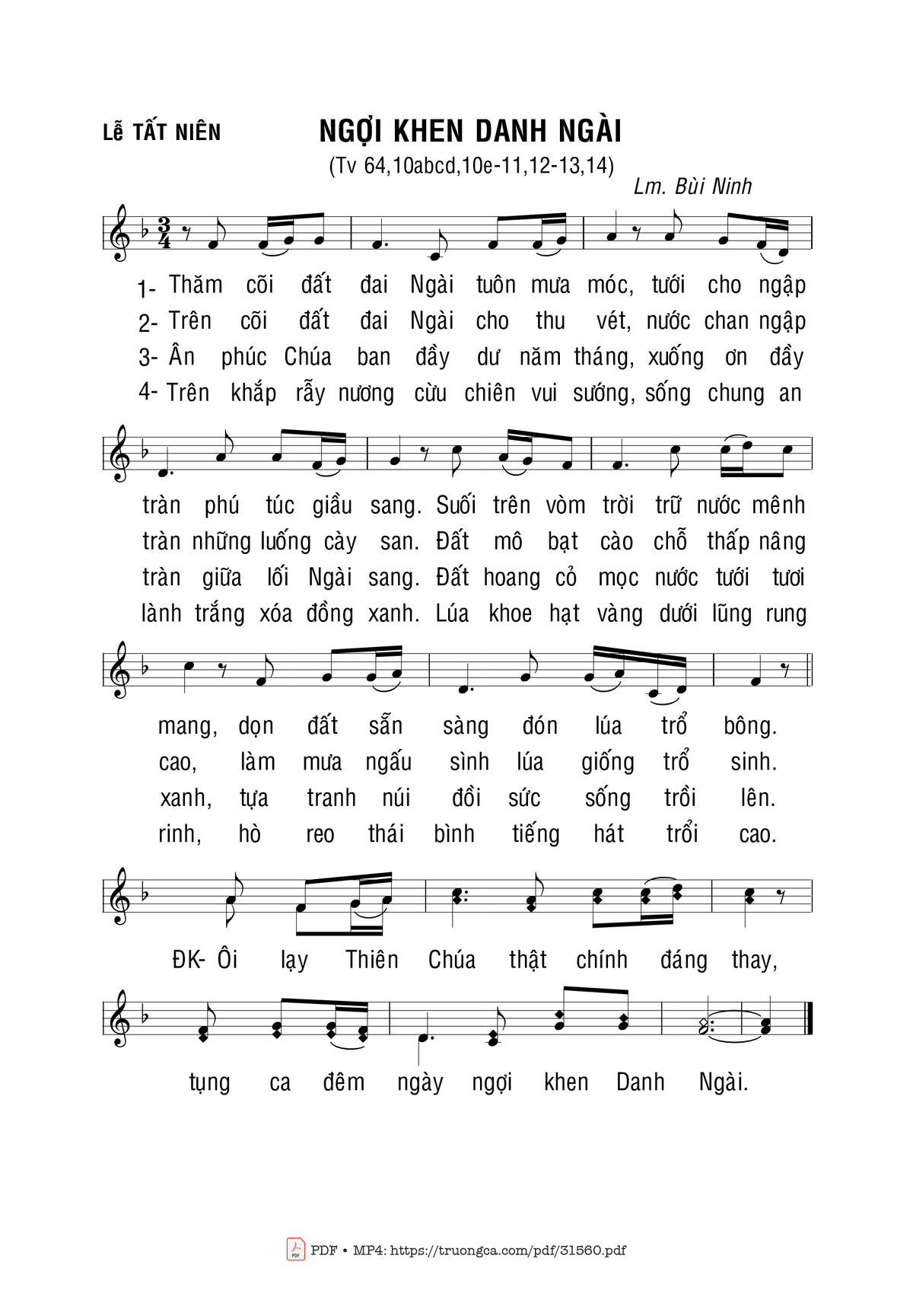 Sheet nhạc có nốt Ngợi Khen Danh Ngài của nhạc sĩ Bùi Ninh và file PDF nốt nhạc đăng lên đây nhằm giúp các bạn xướng âm cho đúng nốt và hát thêm hay, chỉ mang tính chất tham khảo, không có mục đích thương mại. Bản quyền thuộc về tác giả và tổ chức nắm bản quyền, Truongca.com không giữ bất kỳ bản quyền của nội dung nào cả. Các bạn có thể tải về bản PDF chất lượng cao, gồm khuông nhạc có nốt với đường link file PDF bên trên.