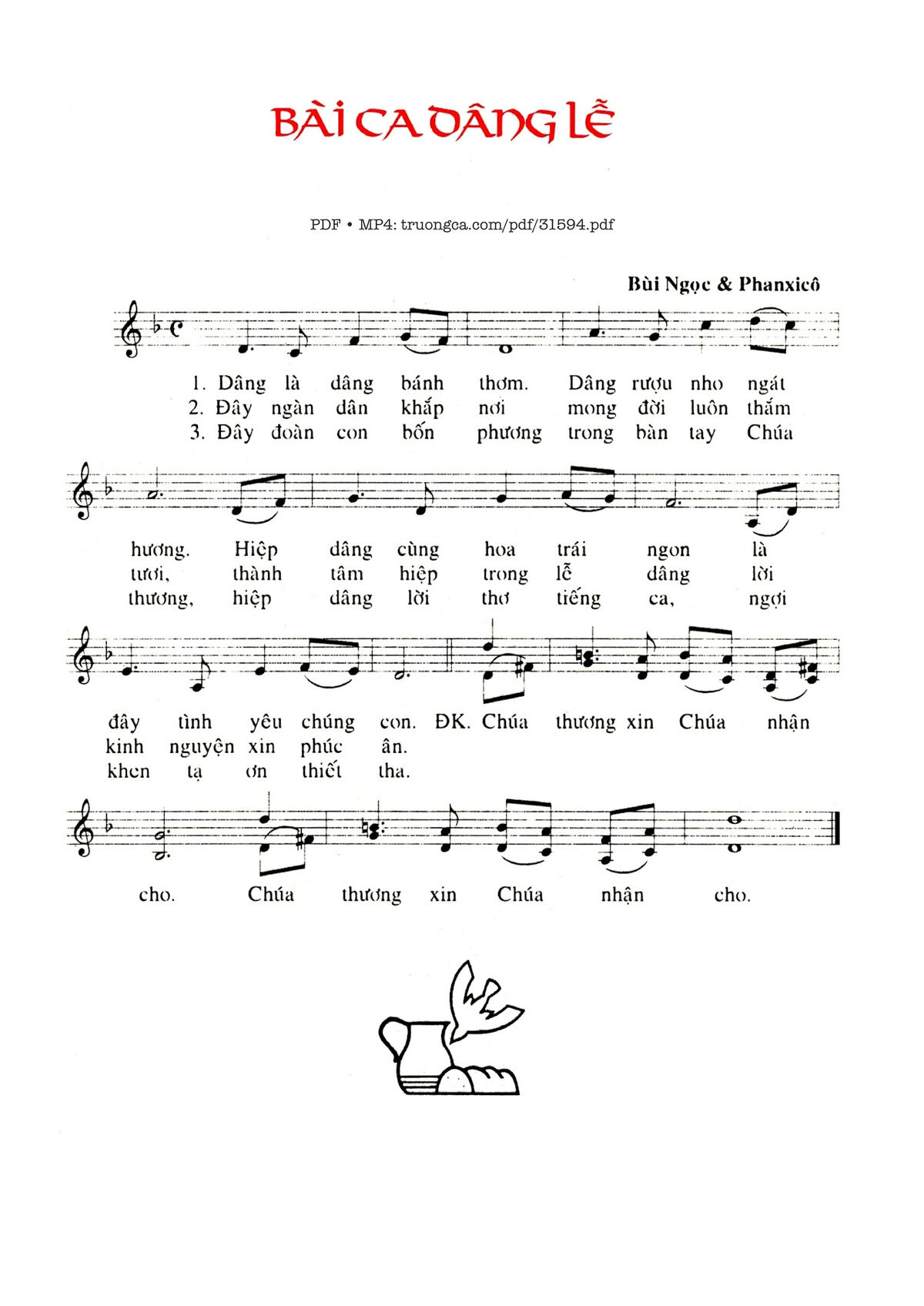 Sheet nhạc có nốt Bài Ca Dâng Lễ của nhạc sĩ Phanxico và file PDF nốt nhạc đăng lên đây nhằm giúp các bạn xướng âm cho đúng nốt và hát thêm hay, chỉ mang tính chất tham khảo, không có mục đích thương mại. Bản quyền thuộc về tác giả và tổ chức nắm bản quyền, Truongca.com không giữ bất kỳ bản quyền của nội dung nào cả. Các bạn có thể tải về bản PDF chất lượng cao, gồm khuông nhạc có nốt với đường link file PDF bên trên.