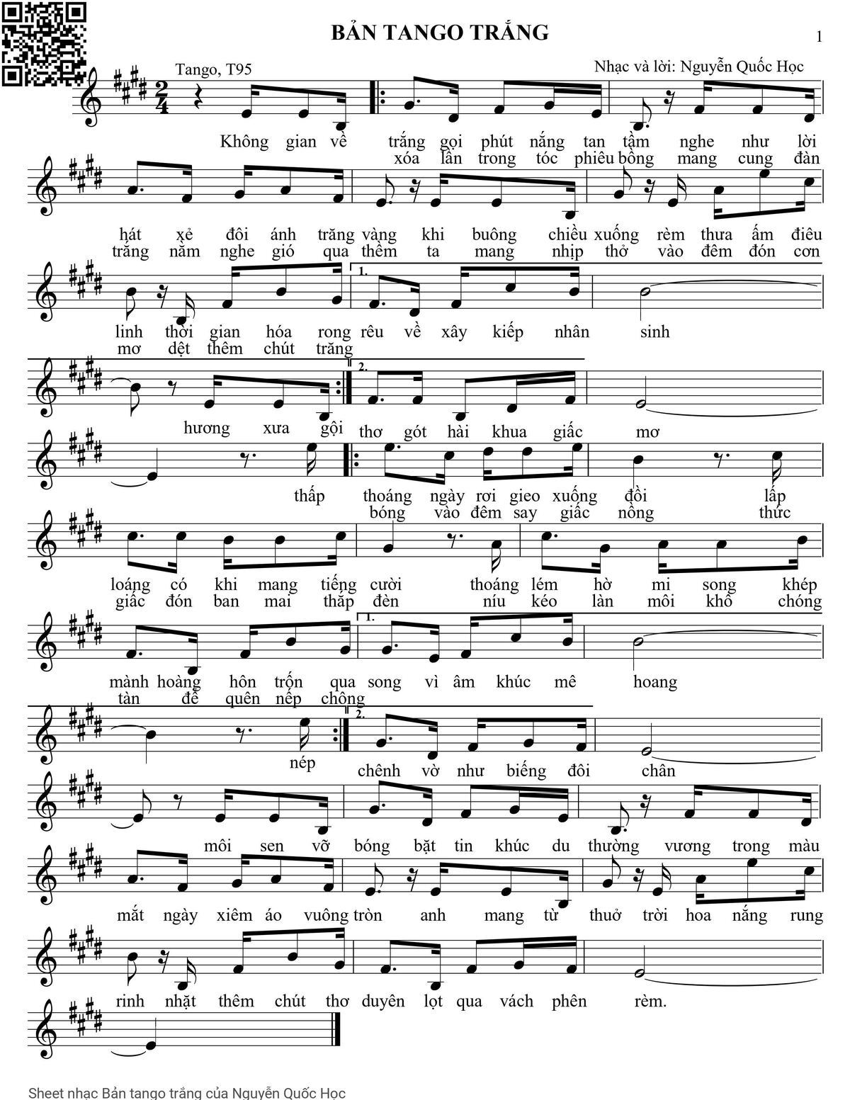 Phần nghe hát Bản tango trắng (Nguyễn Quốc Học) được nhúng từ Youtube, Musescore hoặc link ngoài và chịu sự kiểm soát bản quyền của bên thứ ba đó, vì vậy có thể bị xóa hoặc chèn quảng cáo bất kỳ lúc nào. Nếu bạn không nghe - xem được ca sĩ hát tức là đã bị Youtube hoặc Musescore kiểm soát.