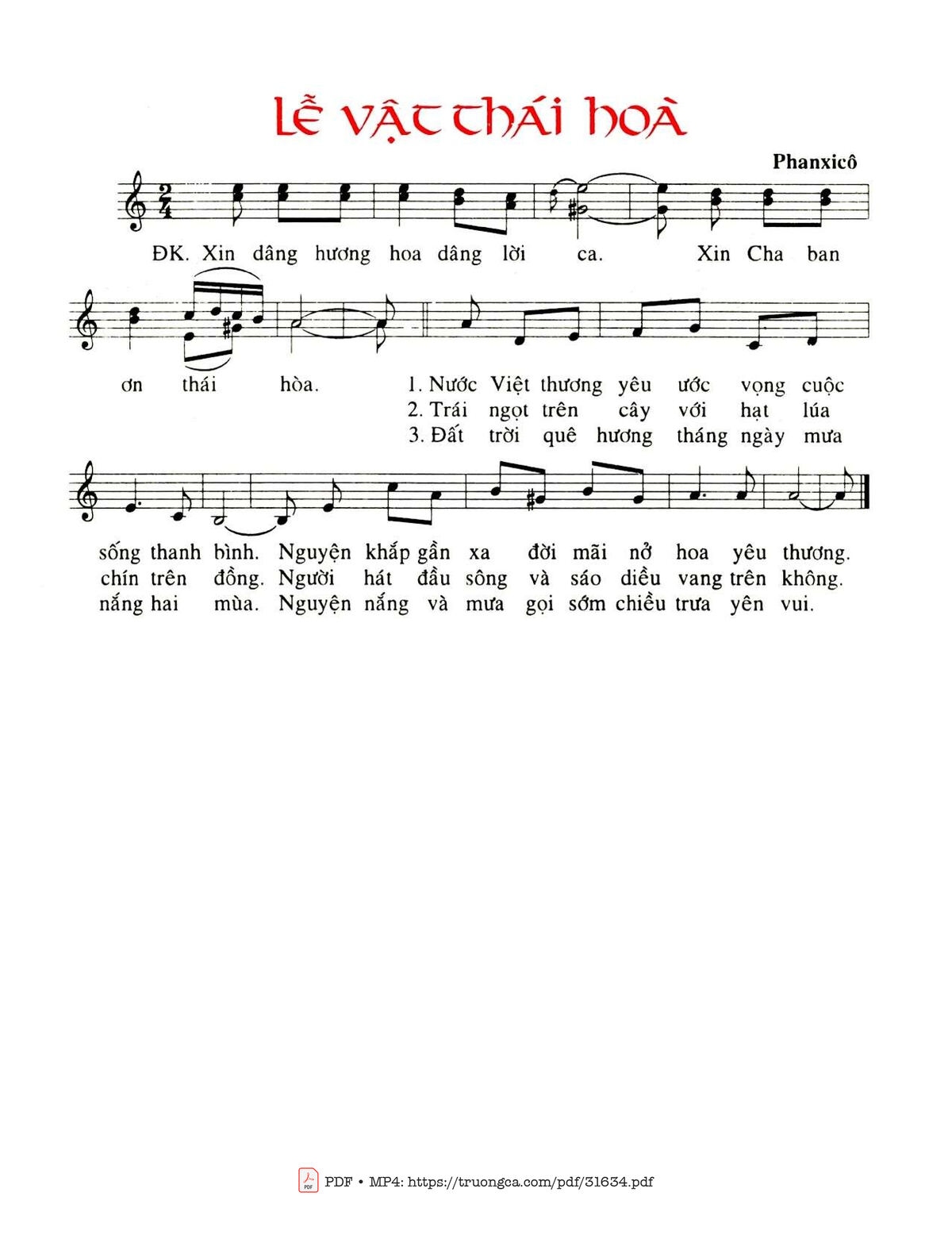 Sheet nhạc có nốt Lễ Vật Thái Hòa của nhạc sĩ Phanxico và file PDF nốt nhạc đăng lên đây nhằm giúp các bạn xướng âm cho đúng nốt và hát thêm hay, chỉ mang tính chất tham khảo, không có mục đích thương mại. Bản quyền thuộc về tác giả và tổ chức nắm bản quyền, Truongca.com không giữ bất kỳ bản quyền của nội dung nào cả. Các bạn có thể tải về bản PDF chất lượng cao, gồm khuông nhạc có nốt với đường link file PDF bên trên.