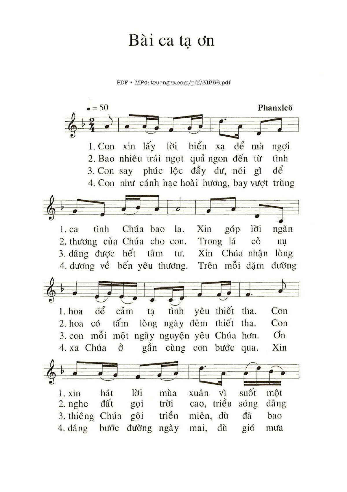 Sheet nhạc có nốt Bài Ca Tạ Ơn của nhạc sĩ Phanxico và file PDF nốt nhạc đăng lên đây nhằm giúp các bạn xướng âm cho đúng nốt và hát thêm hay, chỉ mang tính chất tham khảo, không có mục đích thương mại. Bản quyền thuộc về tác giả và tổ chức nắm bản quyền, Truongca.com không giữ bất kỳ bản quyền của nội dung nào cả. Các bạn có thể tải về bản PDF chất lượng cao, gồm khuông nhạc có nốt với đường link file PDF bên trên.