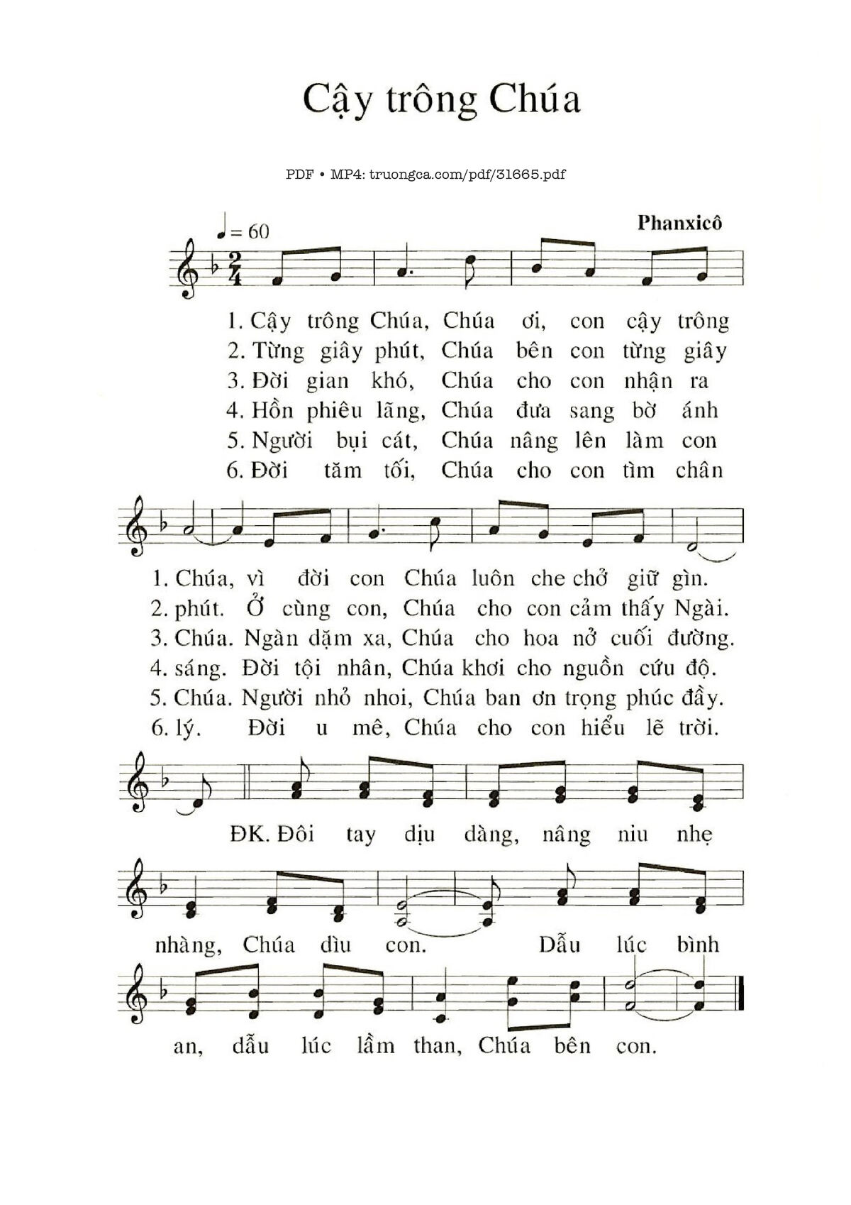 Sheet nhạc có nốt Cậy Trông Chúa của nhạc sĩ Phanxico và file PDF nốt nhạc đăng lên đây nhằm giúp các bạn xướng âm cho đúng nốt và hát thêm hay, chỉ mang tính chất tham khảo, không có mục đích thương mại. Bản quyền thuộc về tác giả và tổ chức nắm bản quyền, Truongca.com không giữ bất kỳ bản quyền của nội dung nào cả. Các bạn có thể tải về bản PDF chất lượng cao, gồm khuông nhạc có nốt với đường link file PDF bên trên.
