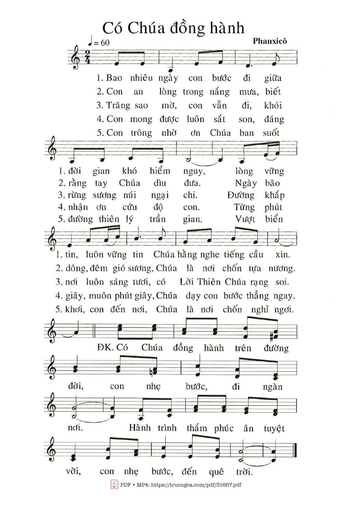 Sheet nhạc có nốt Có Chúa Đồng Hành của nhạc sĩ Phanxico và file PDF nốt nhạc đăng lên đây nhằm giúp các bạn xướng âm cho đúng nốt và hát thêm hay, chỉ mang tính chất tham khảo, không có mục đích thương mại. Bản quyền thuộc về tác giả và tổ chức nắm bản quyền, Truongca.com không giữ bất kỳ bản quyền của nội dung nào cả. Các bạn có thể tải về bản PDF chất lượng cao, gồm khuông nhạc có nốt với đường link file PDF bên trên.