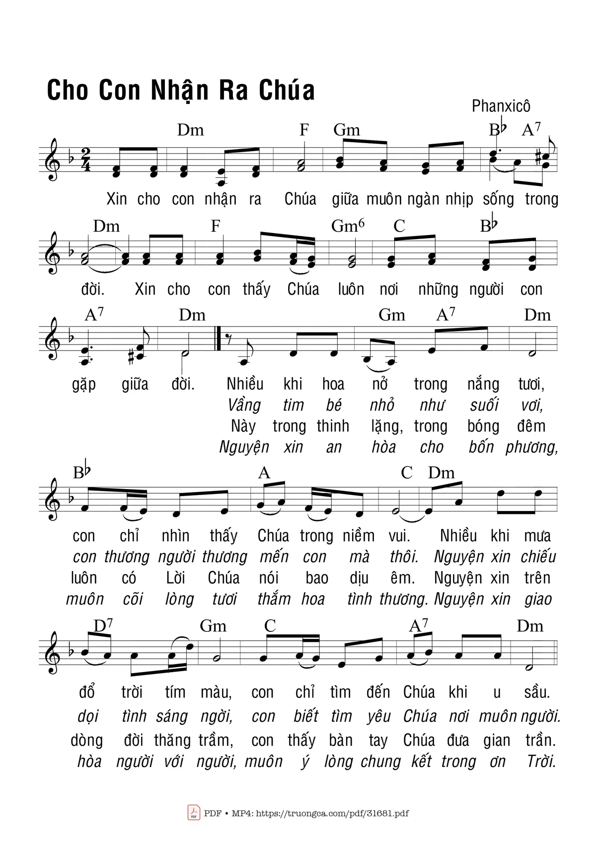 Sheet nhạc có nốt Cho Con Nhận Ra Chúa của nhạc sĩ Phanxico và file PDF nốt nhạc đăng lên đây nhằm giúp các bạn xướng âm cho đúng nốt và hát thêm hay, chỉ mang tính chất tham khảo, không có mục đích thương mại. Bản quyền thuộc về tác giả và tổ chức nắm bản quyền, Truongca.com không giữ bất kỳ bản quyền của nội dung nào cả. Các bạn có thể tải về bản PDF chất lượng cao, gồm khuông nhạc có nốt với đường link file PDF bên trên.