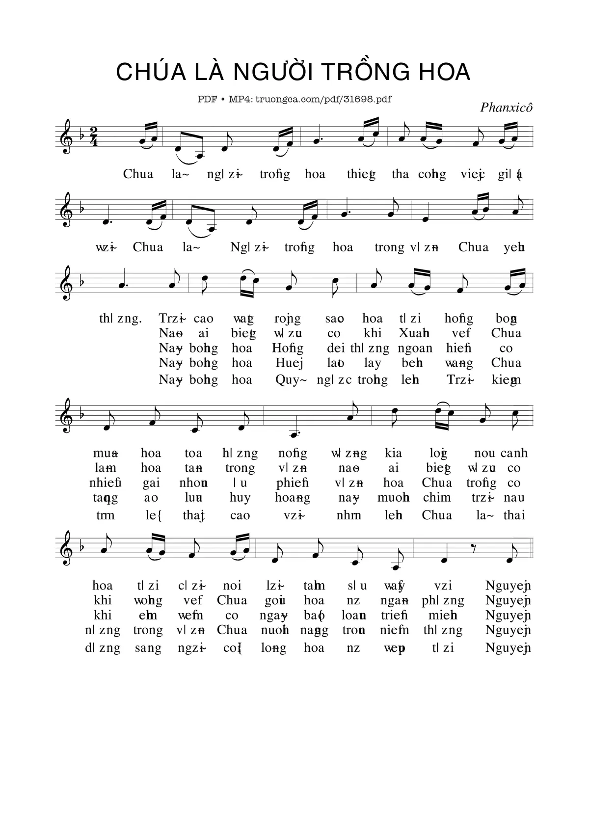 Sheet nhạc có nốt Chúa Là Người Trồng Hoa của nhạc sĩ Phanxico và file PDF nốt nhạc đăng lên đây nhằm giúp các bạn xướng âm cho đúng nốt và hát thêm hay, chỉ mang tính chất tham khảo, không có mục đích thương mại. Bản quyền thuộc về tác giả và tổ chức nắm bản quyền, Truongca.com không giữ bất kỳ bản quyền của nội dung nào cả. Các bạn có thể tải về bản PDF chất lượng cao, gồm khuông nhạc có nốt với đường link file PDF bên trên.