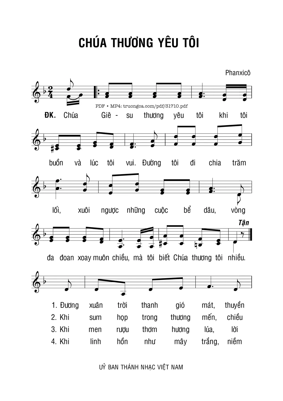 Sheet nhạc có nốt Chúa Thương Yêu Tôi của nhạc sĩ Phanxico và file PDF nốt nhạc đăng lên đây nhằm giúp các bạn xướng âm cho đúng nốt và hát thêm hay, chỉ mang tính chất tham khảo, không có mục đích thương mại. Bản quyền thuộc về tác giả và tổ chức nắm bản quyền, Truongca.com không giữ bất kỳ bản quyền của nội dung nào cả. Các bạn có thể tải về bản PDF chất lượng cao, gồm khuông nhạc có nốt với đường link file PDF bên trên.