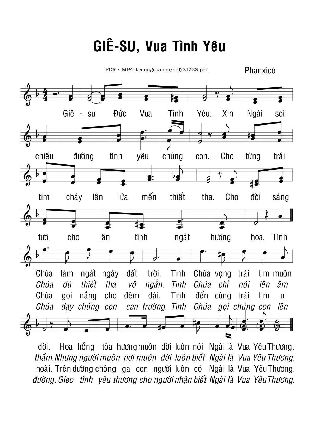 Sheet nhạc có nốt Giêsu Vua Tình Yêu của nhạc sĩ Phanxico và file PDF nốt nhạc đăng lên đây nhằm giúp các bạn xướng âm cho đúng nốt và hát thêm hay, chỉ mang tính chất tham khảo, không có mục đích thương mại. Bản quyền thuộc về tác giả và tổ chức nắm bản quyền, Truongca.com không giữ bất kỳ bản quyền của nội dung nào cả. Các bạn có thể tải về bản PDF chất lượng cao, gồm khuông nhạc có nốt với đường link file PDF bên trên.