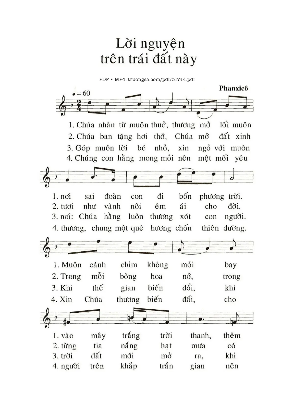 Sheet nhạc có nốt Lời Nguyện Trong Trái Đất Này của nhạc sĩ Phanxico và file PDF nốt nhạc đăng lên đây nhằm giúp các bạn xướng âm cho đúng nốt và hát thêm hay, chỉ mang tính chất tham khảo, không có mục đích thương mại. Bản quyền thuộc về tác giả và tổ chức nắm bản quyền, Truongca.com không giữ bất kỳ bản quyền của nội dung nào cả. Các bạn có thể tải về bản PDF chất lượng cao, gồm khuông nhạc có nốt với đường link file PDF bên trên.