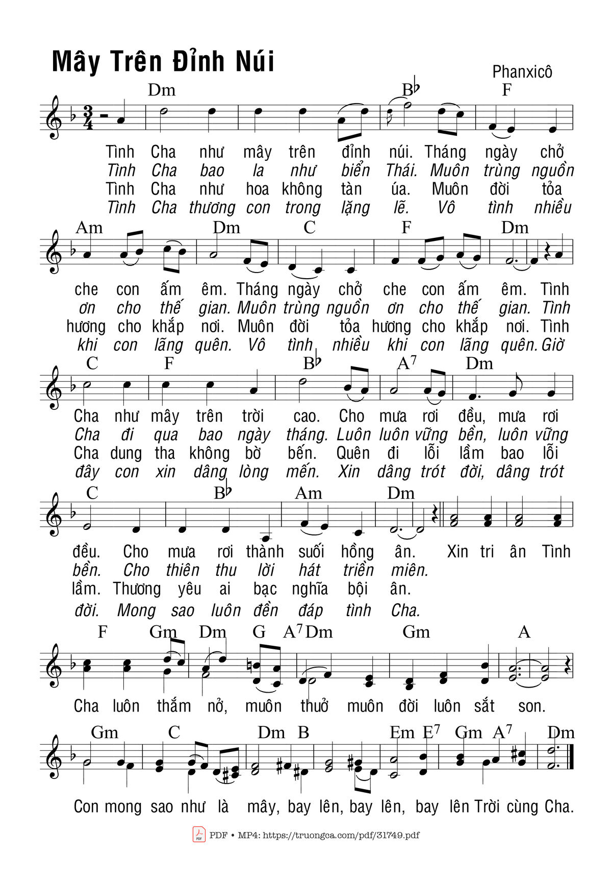 Sheet nhạc có nốt Mây Trên Đỉnh Núi của nhạc sĩ Phanxico và file PDF nốt nhạc đăng lên đây nhằm giúp các bạn xướng âm cho đúng nốt và hát thêm hay, chỉ mang tính chất tham khảo, không có mục đích thương mại. Bản quyền thuộc về tác giả và tổ chức nắm bản quyền, Truongca.com không giữ bất kỳ bản quyền của nội dung nào cả. Các bạn có thể tải về bản PDF chất lượng cao, gồm khuông nhạc có nốt với đường link file PDF bên trên.