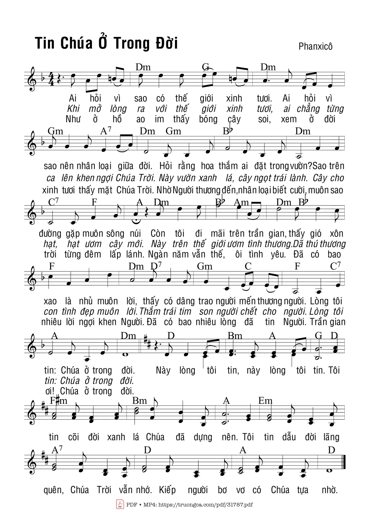 Sheet nhạc có nốt Tin Chúa Ở Trong Đời của nhạc sĩ Phanxico và file PDF nốt nhạc đăng lên đây nhằm giúp các bạn xướng âm cho đúng nốt và hát thêm hay, chỉ mang tính chất tham khảo, không có mục đích thương mại. Bản quyền thuộc về tác giả và tổ chức nắm bản quyền, Truongca.com không giữ bất kỳ bản quyền của nội dung nào cả. Các bạn có thể tải về bản PDF chất lượng cao, gồm khuông nhạc có nốt với đường link file PDF bên trên.