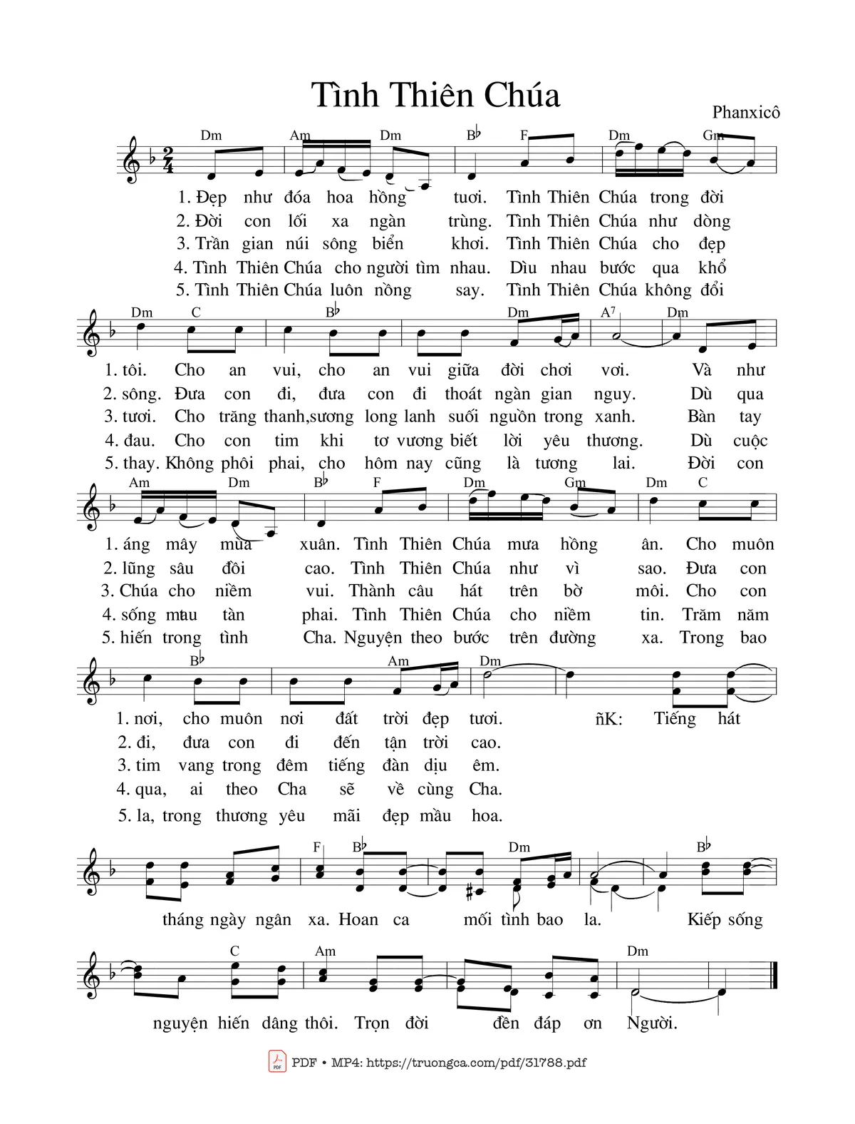 Sheet nhạc có nốt Tình Thiên Chúa của nhạc sĩ Phanxico và file PDF nốt nhạc đăng lên đây nhằm giúp các bạn xướng âm cho đúng nốt và hát thêm hay, chỉ mang tính chất tham khảo, không có mục đích thương mại. Bản quyền thuộc về tác giả và tổ chức nắm bản quyền, Truongca.com không giữ bất kỳ bản quyền của nội dung nào cả. Các bạn có thể tải về bản PDF chất lượng cao, gồm khuông nhạc có nốt với đường link file PDF bên trên.