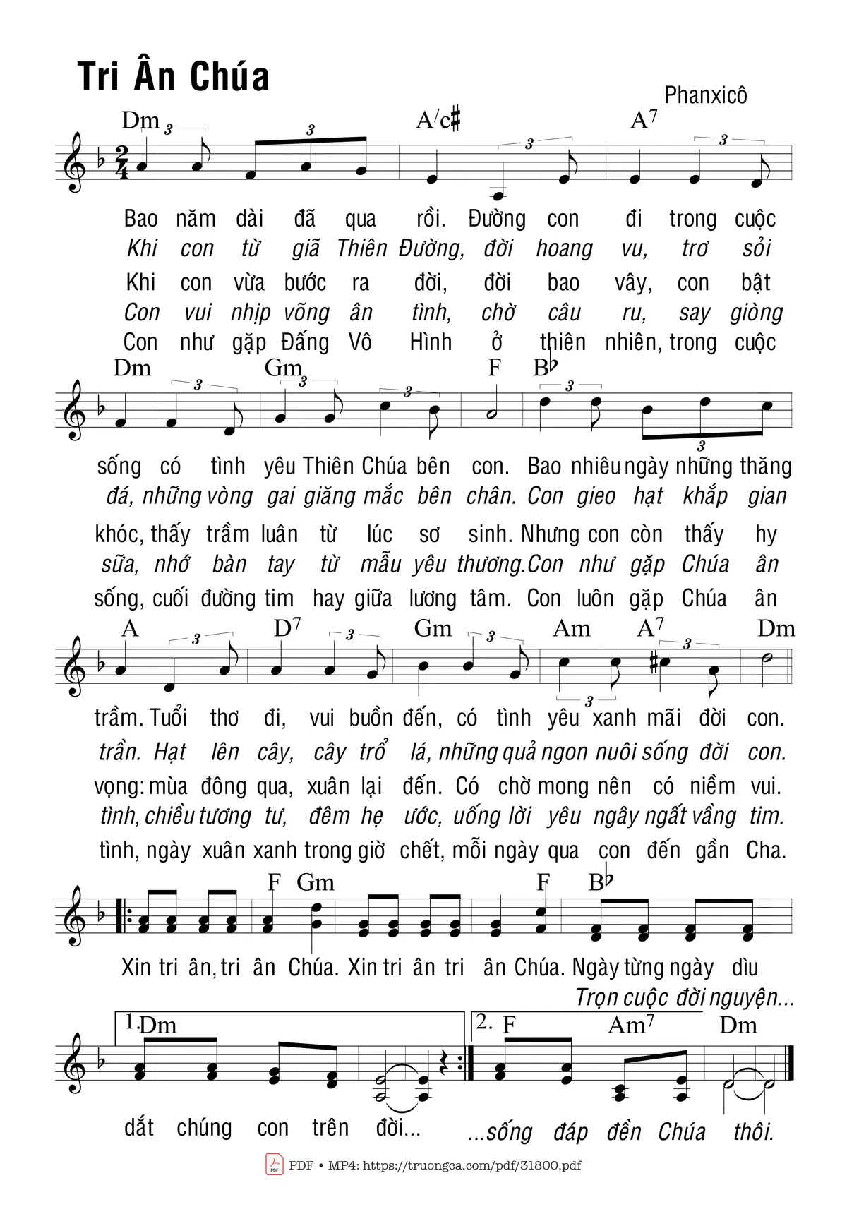 Sheet nhạc có nốt Tri Ân Chúa của nhạc sĩ Phanxico và file PDF nốt nhạc đăng lên đây nhằm giúp các bạn xướng âm cho đúng nốt và hát thêm hay, chỉ mang tính chất tham khảo, không có mục đích thương mại. Bản quyền thuộc về tác giả và tổ chức nắm bản quyền, Truongca.com không giữ bất kỳ bản quyền của nội dung nào cả. Các bạn có thể tải về bản PDF chất lượng cao, gồm khuông nhạc có nốt với đường link file PDF bên trên.