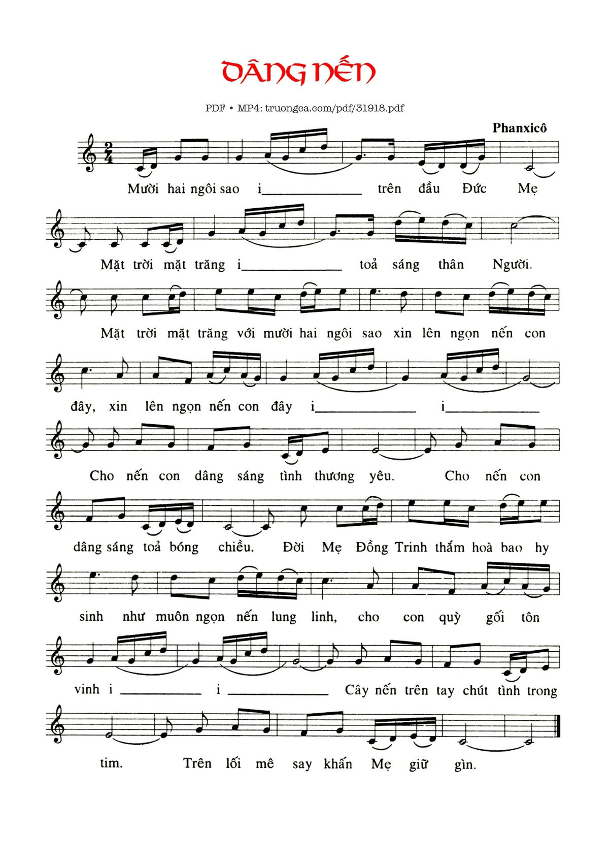 Sheet nhạc có nốt Dâng Nến của nhạc sĩ Phanxico và file PDF nốt nhạc đăng lên đây nhằm giúp các bạn xướng âm cho đúng nốt và hát thêm hay, chỉ mang tính chất tham khảo, không có mục đích thương mại. Bản quyền thuộc về tác giả và tổ chức nắm bản quyền, Truongca.com không giữ bất kỳ bản quyền của nội dung nào cả. Các bạn có thể tải về bản PDF chất lượng cao, gồm khuông nhạc có nốt với đường link file PDF bên trên.