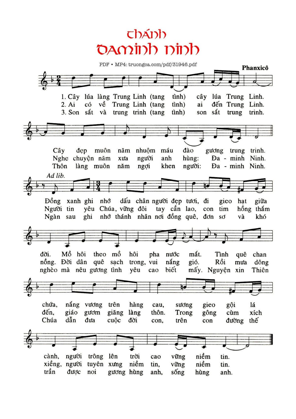 Sheet nhạc có nốt Thánh Đa Minh Ninh của nhạc sĩ Phanxico và file PDF nốt nhạc đăng lên đây nhằm giúp các bạn xướng âm cho đúng nốt và hát thêm hay, chỉ mang tính chất tham khảo, không có mục đích thương mại. Bản quyền thuộc về tác giả và tổ chức nắm bản quyền, Truongca.com không giữ bất kỳ bản quyền của nội dung nào cả. Các bạn có thể tải về bản PDF chất lượng cao, gồm khuông nhạc có nốt với đường link file PDF bên trên.