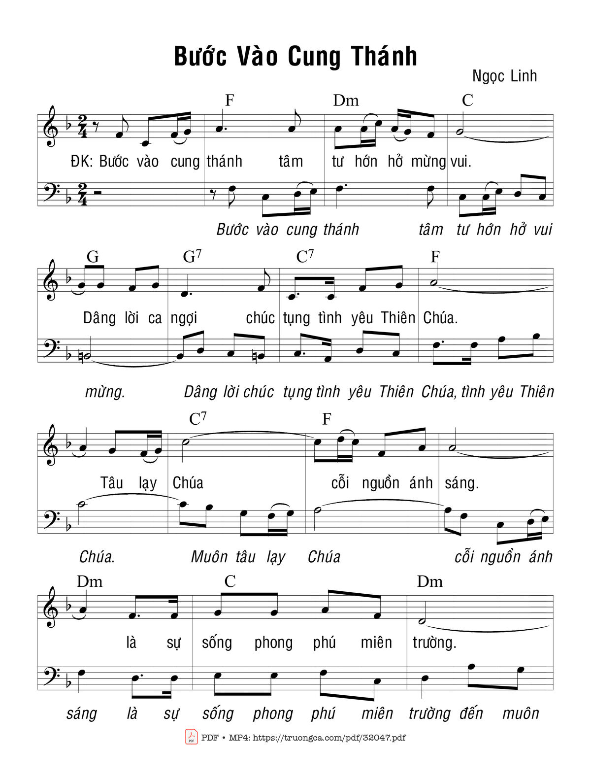 Sheet nhạc có nốt Bước Vào Cung Thánh 2 của nhạc sĩ Ngọc Linh và file PDF nốt nhạc đăng lên đây nhằm giúp các bạn xướng âm cho đúng nốt và hát thêm hay, chỉ mang tính chất tham khảo, không có mục đích thương mại. Bản quyền thuộc về tác giả và tổ chức nắm bản quyền, Truongca.com không giữ bất kỳ bản quyền của nội dung nào cả. Các bạn có thể tải về bản PDF chất lượng cao, gồm khuông nhạc có nốt với đường link file PDF bên trên.