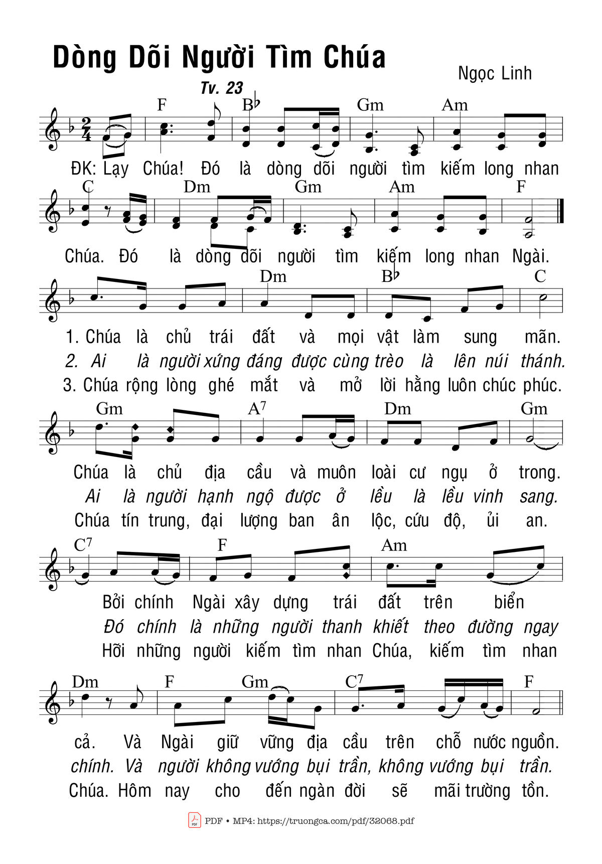 Sheet nhạc có nốt Thánh Vịnh 23, Dòng Dõi Người Tìm Chúa của nhạc sĩ Ngọc Linh và file PDF nốt nhạc đăng lên đây nhằm giúp các bạn xướng âm cho đúng nốt và hát thêm hay, chỉ mang tính chất tham khảo, không có mục đích thương mại. Bản quyền thuộc về tác giả và tổ chức nắm bản quyền, Truongca.com không giữ bất kỳ bản quyền của nội dung nào cả. Các bạn có thể tải về bản PDF chất lượng cao, gồm khuông nhạc có nốt với đường link file PDF bên trên.