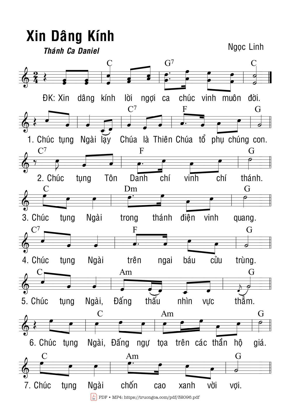 Sheet nhạc có nốt Xin Dâng Kính (Tc Daniel) của nhạc sĩ Ngọc Linh và file PDF nốt nhạc đăng lên đây nhằm giúp các bạn xướng âm cho đúng nốt và hát thêm hay, chỉ mang tính chất tham khảo, không có mục đích thương mại. Bản quyền thuộc về tác giả và tổ chức nắm bản quyền, Truongca.com không giữ bất kỳ bản quyền của nội dung nào cả. Các bạn có thể tải về bản PDF chất lượng cao, gồm khuông nhạc có nốt với đường link file PDF bên trên.