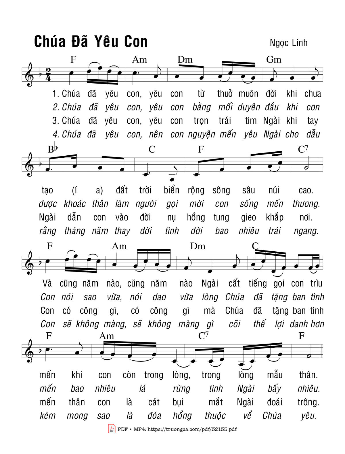 Sheet nhạc có nốt Chúa Đã Yêu Con (2 Bè) của nhạc sĩ Ngọc Linh và file PDF nốt nhạc đăng lên đây nhằm giúp các bạn xướng âm cho đúng nốt và hát thêm hay, chỉ mang tính chất tham khảo, không có mục đích thương mại. Bản quyền thuộc về tác giả và tổ chức nắm bản quyền, Truongca.com không giữ bất kỳ bản quyền của nội dung nào cả. Các bạn có thể tải về bản PDF chất lượng cao, gồm khuông nhạc có nốt với đường link file PDF bên trên.